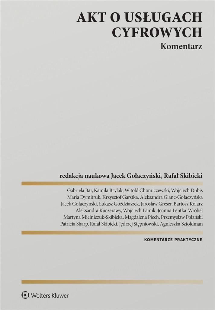 Książka omawia przepisy Aktu o usługach cyfrowych (DSA) od strony praktycznej z uwzględnieniem aktualnego dorobku nauki polskiej i zagranicznej. Przedstawia ona zmiany, jakie wprowadza DSA w stosunku do wcześniejszych regulacji dyrektywy o handlu elektronicznym oraz ustawy o świadczeniu usług drogą elektroniczną. Unikalną wartością komentarza jest także uwzględnienie polskiego projektu ustawy o zmianie ustawy o świadczeniu usług drogą elektroniczną, który ma wdrożyć Akt o usługach cyfrowych do prawa polskiego. Publikacja szczegółowo prezentuje nowe reguluje dotyczące m. in.: obowiązku moderowania nielegalnych treści w Internecie przez platformy typu Facebook, X (dawniej Twitter) czy Google, a także wprowadzania obowiązkowej oceny ryzyka i większej przejrzystości algorytmów, co pomoże w walce ze szkodliwymi treściami i dezinformacją w sieci. Książka przeznaczona jest przede wszystkim dla prawników praktyków, w tym sędziów, adwokatów, radców prawnych, prokuratorów, a także pracowników administracji oraz pracowników naukowych. Będzie ona również pomocna przedsiębiorcom z branż e-commerce, platform internetowych oraz dostawcom usług pośrednich. "Publikacja (...) wychodzi naprzeciw oczekiwaniom środowiska prawniczego oraz IT w związku z wejściem w życie DSA, czyli Aktu o usługach cyfrowych, stanowiącego niejako konstytucję dla Internetu. Lektura obowiązkowa dla specjalistów prawa nowych technologii. Regulacja ta jest odpowiedzią na wyzwania związane z nowoczesnymi platformami internetowymi i zmianami w Internecie, jakie nastąpiły od 2000 roku, to jest od przyjęcia dyrektywy o handlu elektronicznym". Z recenzji prof. Dariusza Szostka Brak recenzjix