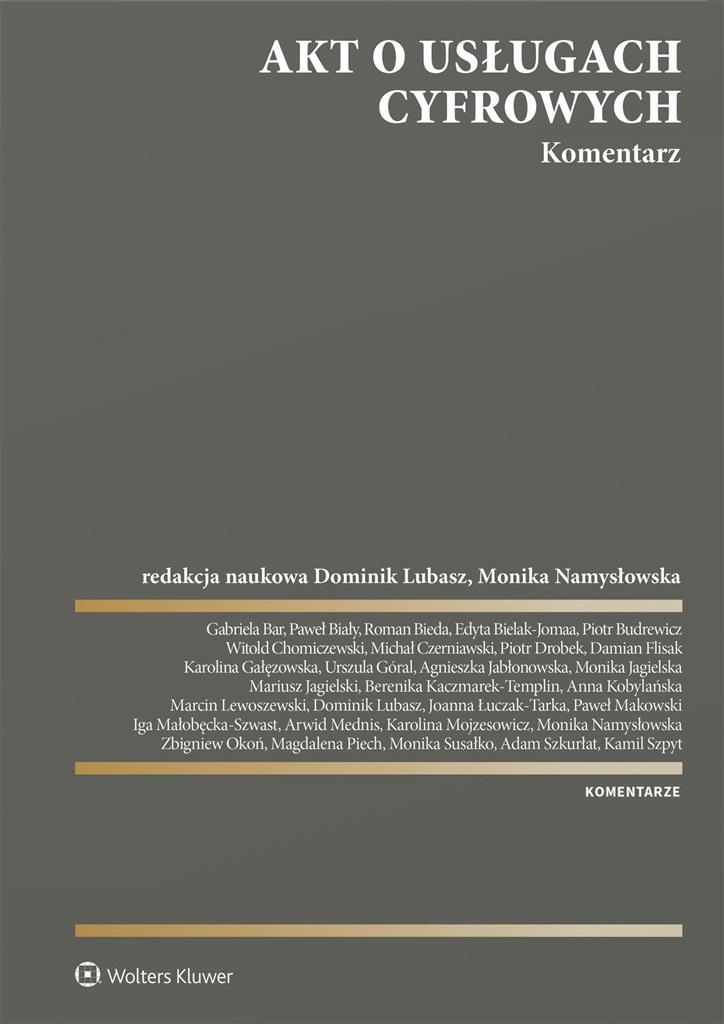 Komentarz zawiera najbardziej kompleksowe na rynku opracowanie i wyjaśnienie regulacji aktu o usługach cyfrowych, ze wskazaniem kierunków wykładni, ułatwiających wdrożenie przepisów przez podmioty zobowiązane, przed wszystkim oferujących usługi pośrednie online, jak i stosowanie zarówno przez komercyjnych użytkowników usług cyfrowych, jak i organy nadzorcze. Opracowanie w sposób szczegółowy omawia nowe regulacje, które mają na celu w szczególności: zwalczanie nielegalnych treści online, w tym odnoszących się do nielegalnych towarów i usług, wzmocnienie pozycji użytkowników i ich przedstawicieli, w tym przez zapewnienie możliwości zgłaszania nielegalnych treści, zakwestionowania decyzji o moderowaniu treści i dochodzenia zadośćuczynienia za pośrednictwem mechanizmu rozstrzygania sporów lub zadośćuczynienia sądowego, wprowadzeniu obowiązków systemowej oceny i mitygowania ryzyka nakładanych na VLOP i VLOSE oraz zabezpieczenia dzieci oraz ograniczenia w wykorzystywaniu wrażliwych danych osobowych do celów reklamy targetowanej; wzmocnienie nadzoru i egzekwowania przepisów wobec wszystkich dostawców usług pośrednich, przy istotnej roli niezależnych koordynatorów ds. usług cyfrowych w każdym państwie członkowskim UE i Europejskiej Rady ds. Usług Cyfrowych, a ponadto wyposażenie Komisji Europejskiej w dodatkowe uprawnienia nadzorcze w odniesieniu do VLOP i VLOSE. Wkład w opracowanie komentarza wniosło prawie 30 autorów o rozległych kompetencjach merytorycznych z zakresu problematyki nowych technologii, usług cyfrowych, ochrony danych osobowych, będących praktykami z Parlamentu Europejskiego, Komisji Europejskiej, Urzędu Ochrony Danych Osobowych, Kancelarii Sejmu, ekspertów Europejskiej Rady Ochrony Danych, organizacji branżowych, jak i doradcami prawnymi z renomowanych kancelarii prawnych oraz z działów prawnych dużych przedsiębiorstw internetowych, przedstawicielami nauki polskiej i międzynarodowej z wiodących uczelni. Komentarz przeznaczony jest dla dostawców usług pośrednich (dostawców dostępu do internetu, usług hostingowych, takie jak przetwarzanie w chmurze, rejestratorów nazw domen, internetowych, platform handlowych, sklepów z aplikacjami, sieci społecznościowych, platform udostępniania treści, internetowych platform podróży i zakwaterowania), a także dostawców bardzo dużych platform internetowych i bardzo dużych wyszukiwarek internetowych. Publikacja będzie przydatna również prawnikom praktykom - radcom prawnym, adwokatom, sędziom, a także pracownikom administracji rządowej i samorządowej. Brak recenzjix