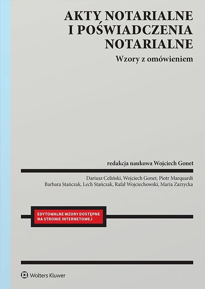 Książka zawiera niezbędne wzory aktów notarialnych oraz poświadczeń stosowanych w codziennej praktyce w kancelariach notarialnych. Jej treść została opracowana specjalnie z myślą o notariuszach, zastępcach notarialnych oraz aplikantach notarialnych, aby ułatwić i usprawnić ich pracę. W publikacji czytelnik znajdzie wzory różnych aktów notarialnych, takich jak akty poświadczenia dziedziczenia, europejskiego poświadczenia dziedziczenia, akty powołania zarządcy sukcesyjnego oraz akty odwołania zarządcy sukcesyjnego. Dzięki nim będziesz mógł skutecznie i profesjonalnie obsługiwać sprawy związane z dziedziczeniem i zarządzaniem sukcesyjnym. W przypadku najpopularniejszych umów – jak sprzedaż, darowizna, protokoły zgromadzeń spółek – starano się przedstawić kilka wzorów dotyczących odmiennych przypadków. W książce zamieszczono także rzadko sporządzane wzory aktów notarialnych, jak np. przekształceń przedsiębiorcy indywidualnego, spółki cywilnej czy spółek osobowych w spółki kapitałowe, zgody małżonków na dokonanie czynności prawnych, zebrań wspólnot mieszkaniowych, odstąpienia od umowy sprzedaży oraz umów z udziałem syndyka masy upadłości. Dodatkowo książka zawiera również wzory poświadczeń, które są bardzo ważne w codziennej pracy notariusza. Publikacja została opracowana przez doświadczonych prawników, którzy posiadają ogromną wiedzę i doświadczenie w dziedzinie notariatu. Dzięki temu można mieć pewność, że jej treść jest rzetelna, aktualna i kompleksowa. Brak recenzjix