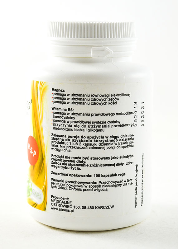 Aliness Cytrynian magnezu 125mg z B6 100 kapsCytrynian magnezu w formie bezwodnej - idealnie rozpuszczający się w wodzie. Zawiera P-5-P czyli pirydoksalo-5-fosforan aktywną formę witaminy B6. Składniki:Magnez (cytrynian magnezu), witamina B6 (pirydoksalo-5-fosforan ), substancja glazurująca: hydroksypropylometyloceluloza.Sposób użycia:1 kapsułka jeden lub dwa razy dziennie w trakcie posiłku.Nie należy przekraczać zalecanej porcji do spożycia w ciągu dnia. Produkt nie może być stosowany jako substytut zróżnicowanej diety. Zaleca się stosowanie zróżnicowanej i zrównoważonej diety i zdrowego trybu życia. Warunki przechowywania: Przechowywać w temperaturze pokojowej w sposób niedostępny dla małych dzieci. Chronić przed wilgocią. Wartości odżywcze Aliness Cytrynian magnezu 125mg z B6 100 kapsSuplement diety