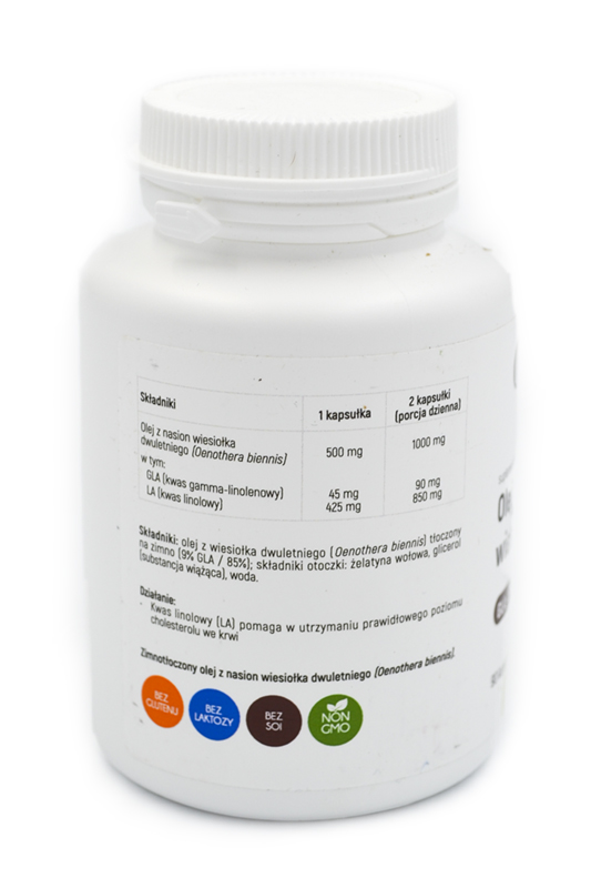 Składniki:olej z nasion wiesiołka dwuletniego (Oenothera biennis) tłoczony na zimno (9% GLA / 85% LA); składniki otoczki: żelatyna wołowa, glicerol (substancja wiążąca), woda.Sposób użycia: