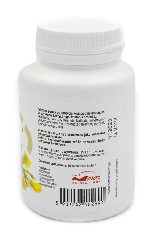 Przechowywanie:Przechowywać w temperaturze pokojowej w sposób niedostępny dla małych dzieci. Chronić przed wilgocią.Wartości odżywcze Aliness Olej z nasion wiesiołka 500mg 90 kapsSuplement diety