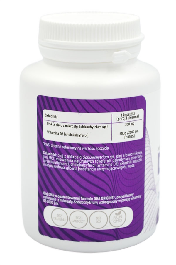 Olej DHA w opatentowanej formule DHA ORIGINS®, pozyskiwany naturalnie z mikroalg Schizochytrium, wzbogacony w porcję witaminy D3 2000 j.m.
