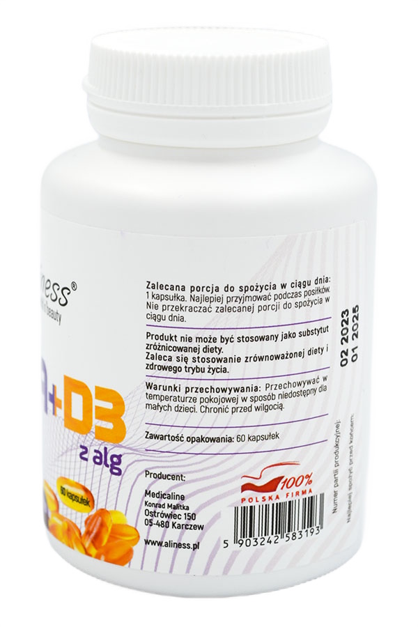 Każda kapsułka Aliness DHA+D3 dostarcza 300 mg niezbędnych kwasów omega-3, w postaci kwasu dokozaheksaenowego (DHA) oraz 2000 IU naturalnej witaminy D3. Składniki:olej z mikroalg Schizochytrium sp., olej słonecznikowy, olej MCT, mieszanina naturalnych tokoferoli, palmitynian askorbylu (przeciwutleniacz), cholekalcyferol (witamina D3); składniki otoczki: żelatyna wołowa, glicerol (substancja utrzymująca wilgoć), woda.Sposób użycia: