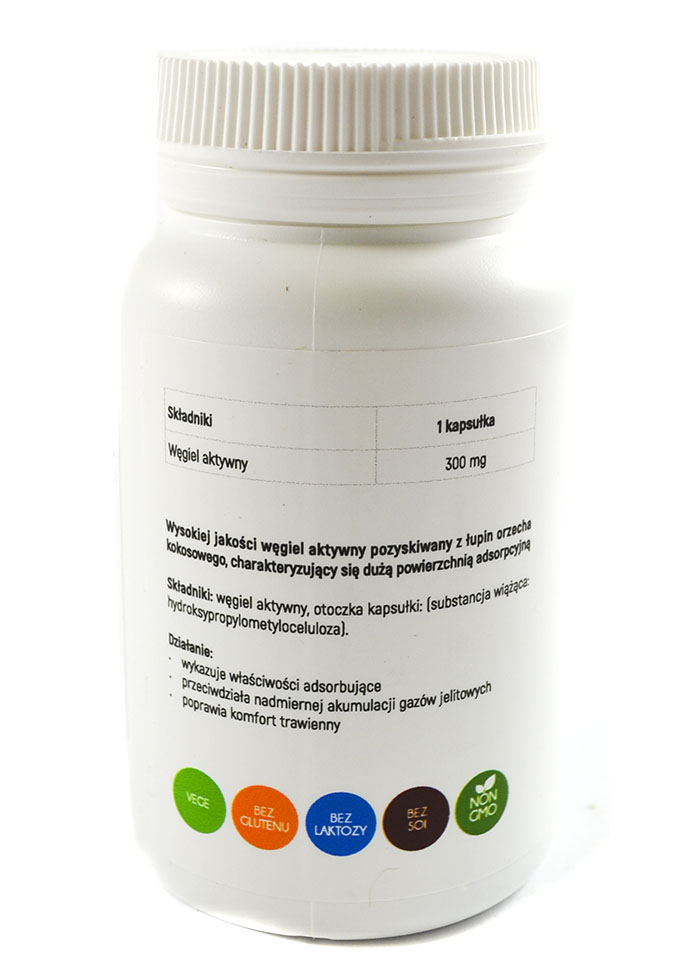 Składniki:węgiel aktywny, otoczka kapsułki: (substancja wiążąca: hydroksypropylometyloceluloza)Sposób użycia: