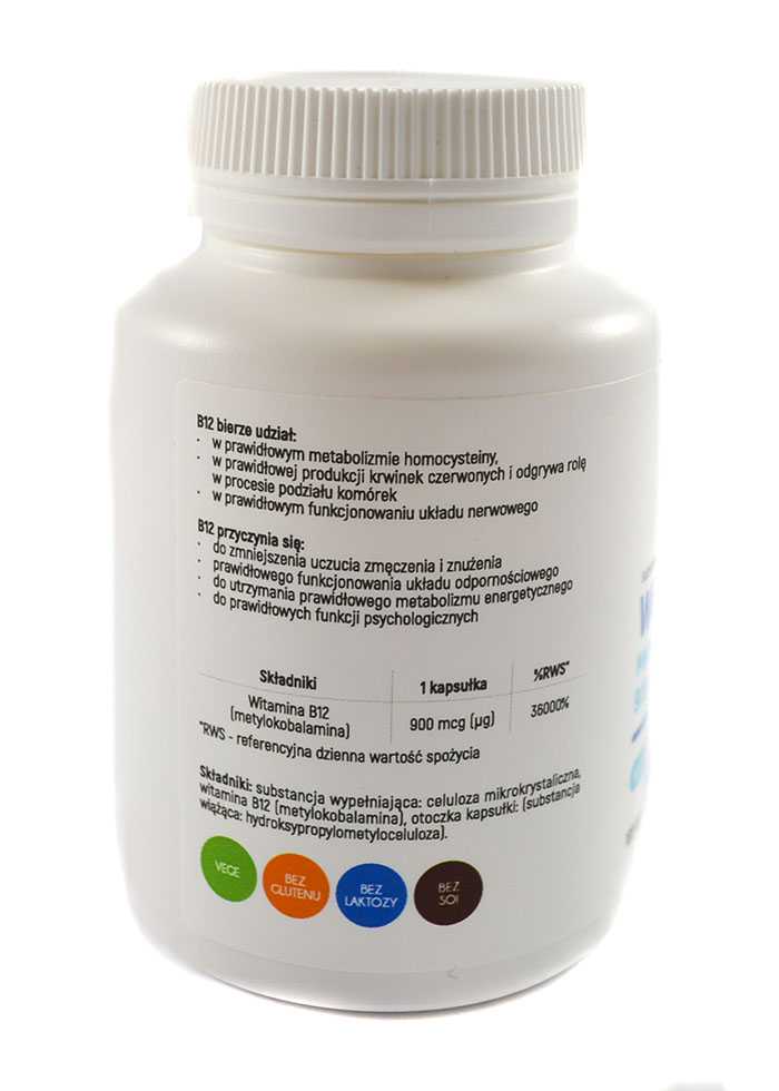 Składniki:substancja wypełniająca: celuloza mikrokrystaliczna, witamina B12 (metylokobalamina). Składniki otoczki: Hydroksypropylometyloceluloza (HPMC) – kapsułka Vcaps® Sposób użycia:1 kapsułka jeden raz dziennie w trakcie posiłku.Nie należy przekraczać zalecanej porcji do spożycia w ciągu dnia. Produkt nie może być stosowany jako substytut zróżnicowanej diety. Zaleca się stosowanie zróżnicowanej i zrównoważonej diety i zdrowego trybu życia. Przechowywanie:Przechowywać w temperaturze pokojowej. Chronić przed wilgocią. Przechowywać w sposób niedostępny dla małych dzieci.