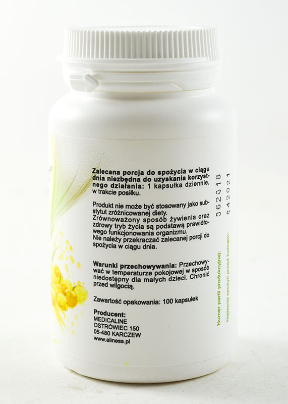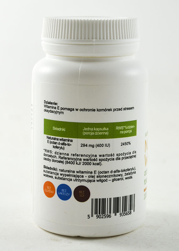 Aliness Witamina E 400IU 100 kapsSkładniki:Naturalna witamina E (octan d-alfa-tokoferylu), substancja wypełniająca - olej słonecznikowy, żelatyna wołowa, substancja utrzymująca wilgoć – glicerol, woda.Sposób użycia:1 kapsułka dziennie, w trakcie posiłku.Produkt nie może być stosowany jako substytut zróżnicowanej diety. Zrównoważony sposób żywienia oraz zdrowy tryb życia są podstawą prawidłowego funkcjonowania organizmu. Nie należy przekraczać zalecanej porcji do spożycia w ciągu dnia. Przechowywanie:Przechowywać w temperaturze pokojowej w sposób niedostępny dla małych dzieci. Chronić przed wilgocią.Wartości odżywcze Aliness Witamina E 400IU 100 kapsSuplement diety