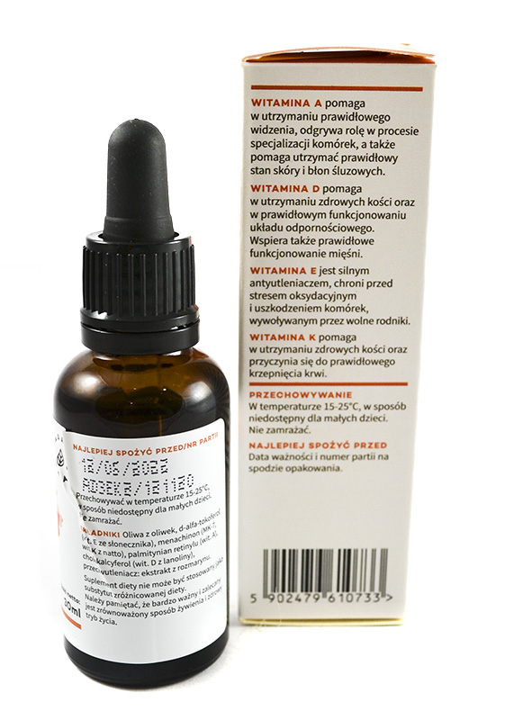 Skład:oliwa z oliwek, d-alfa-tokoferol (witamina E ze słonecznika, Quali®-E), przeciwutleniacz: ekstrakt z rozmarynu, menachinon-7 (witamina K z natto (soja)), palmitynian retinylu (witamina A, Quali®-A), cholekalcyferol (witamina D z lanoliny, Quali®-D)Sposób użycia: