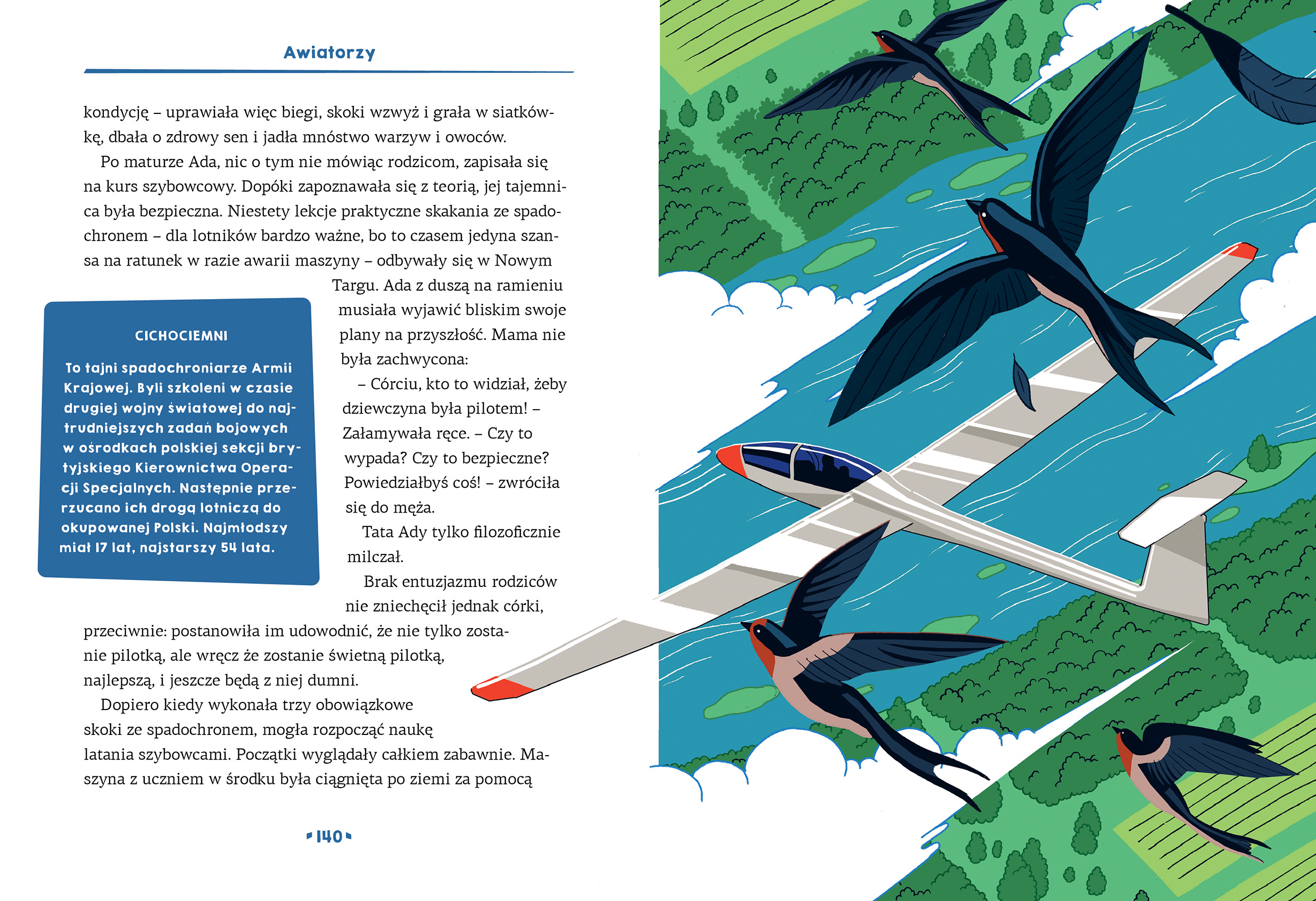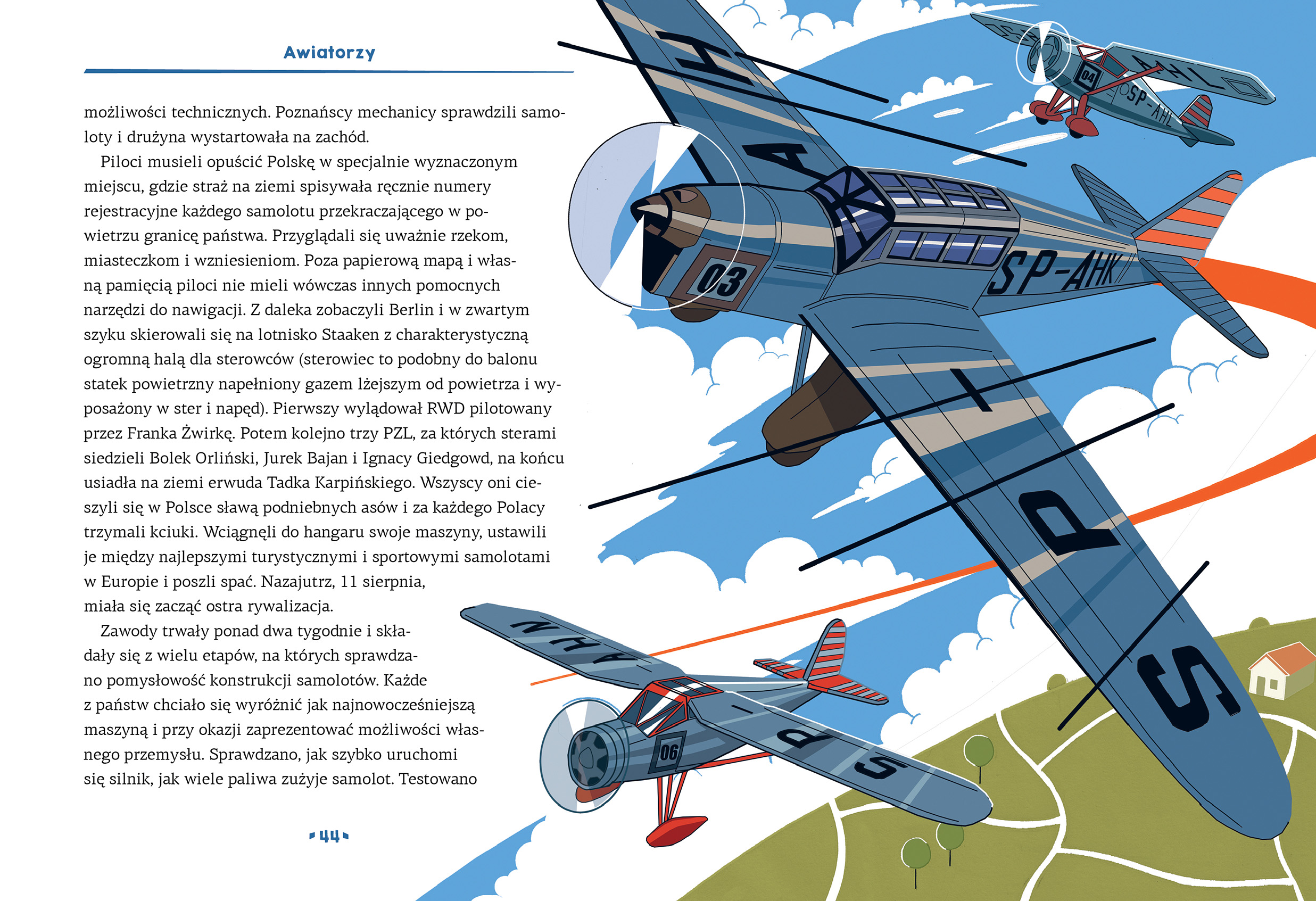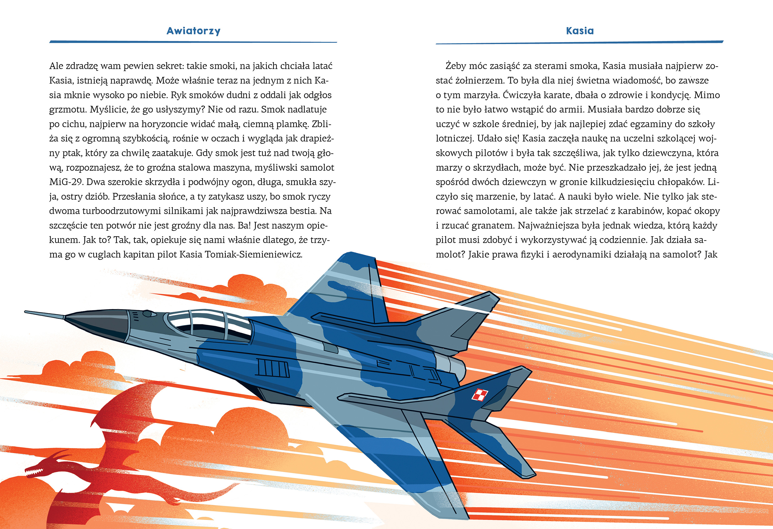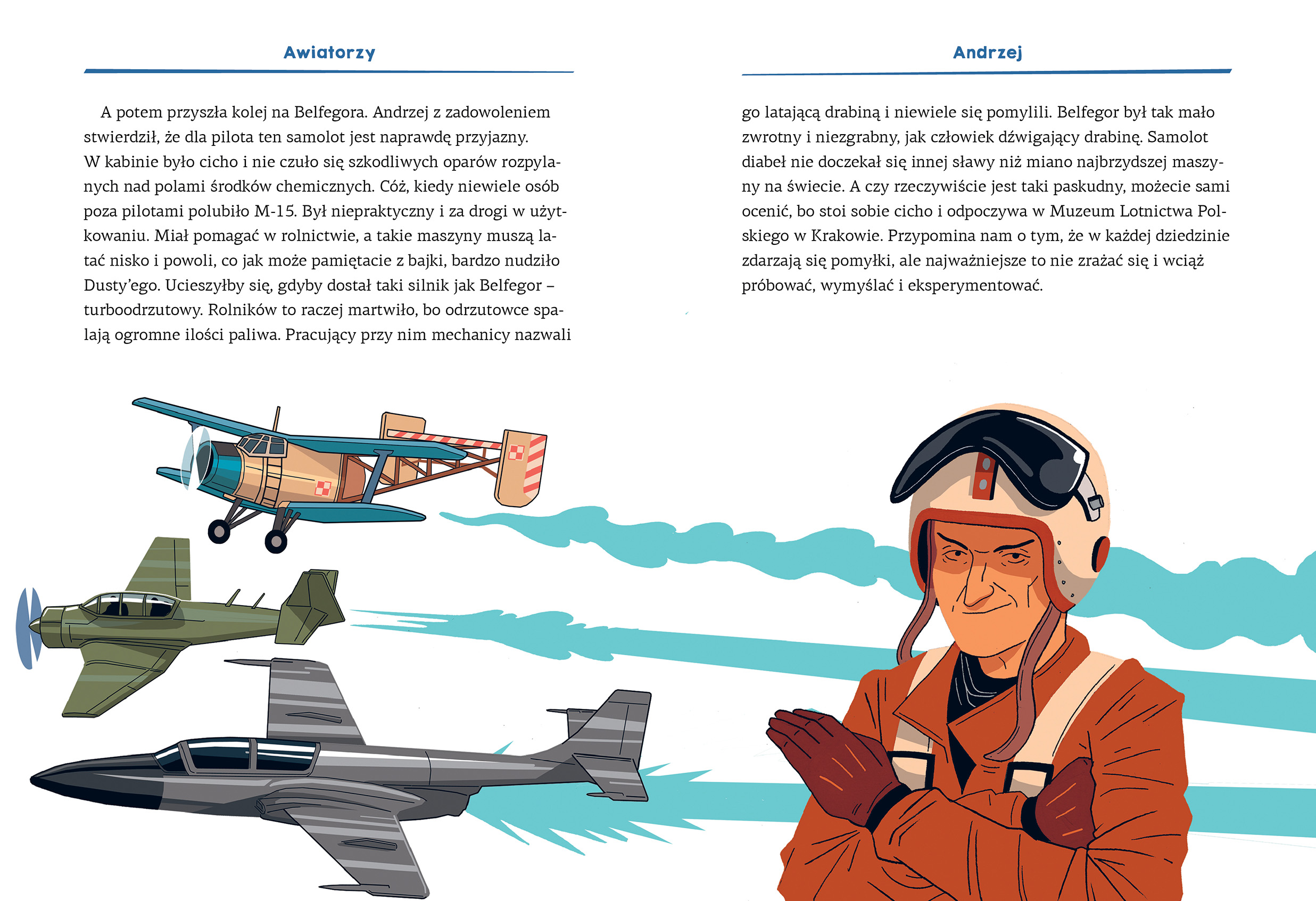 Od dzieciństwa marzyli o podniebnych przygodach, o tym, by siąść za sterami samolotu, wzbić się w powietrze i królować w przestworzach. Poznaj niesamowite historie polskich lotniczek i lotników, poskramiaczy metalowych smoków, pilo-tów oblatywaczy, szybowników, a nawet kosmonautów. Jak długo musiał czekać na poprawę pogody Sebastian Kawa, żeby jako pierwszy (i póki co jedyny) człowiek na świecie przelecieć szybowcem nad Himalajami? Jak wyglądała czekolada, którą Mirek Hermaszewski, jedyny polski kosmonauta, jadł na stacji kosmicznej orbitującej wokół Ziemi? W jakim niecodziennym stroju Stanisław Skarżyński przeleciał samotnie Atlantyk małym turystycznym samolotem (do dziś nikt mniejszym nie pokonał oceanu)? Ile kilometrów musieli przebyć – i ile drużyn pokonać – Żwirko i Wigura w najbardziej wyczerpują-cym rajdzie samolotowym dookoła Europy? Jaki fortel zastosowała Ada Dankowska, najsłynniejsza polska szybowniczka, podczas swojego brawurowego lotu po rekord świata? Marzenia są w zasięgu ręki, a właściwie w zasięgu… skrzydeł! Latać, ale czym? Za każdym lotnikiem stoi – leci! – jego ulubiona maszyna. Samoloty i szybowce mają swoje imiona, często nadawane na cześć konstruktorów, i specjalne podniebne moce, a co najważniejsze: dają się prowadzić tylko wybranym, po prostu najlepszym. Jak okiełznać metalowego smoka MiG-29? Kiedy docisnąć RWD-6, czyli erwudę, żeby przyspieszyć na ostatnich metrach rajdu i wygrać? Jak wprowadzić szybowiec w podniebny taniec… z bocianami i jaskółkami? Dlaczego jedyny na świecie odrzutowy samolot rolniczy dostał imię demona Belfegora? Kolorowe ilustracje, na których wiernie zostały pokazane samoloty, szybowce z różnych czasów, a nawet rakiety kosmiczne, będą nie lada gratką dla przyszłych konstruktorów. A co o swoich przygodach mówią sami bohaterowie? „W lotnictwie kocham to uczucie oderwania od przyziemnego bałaganu. Z góry wszystko wygląda jak piękny malunek. Na dole jest szaro, deszczowo, a ja odrywam się i wychodzę ponad chmury, w słońce i błękit nieba”. Paulina Różyło-Nowicka, pilot oblatywacz „Szybownictwo to piękny sport, dla wnuków i dla dziadków. Można zacząć naprawdę wcześnie i latać bardzo długo, całe życie. To moja pasja, podobnie jak zdobywanie rekordów i wyznaczanie sobie celów. A także radość z sukcesu. Ta radość może być udziałem każdego małego marzyciela”. Ada Dankowska, 15-krotna rekordzistka świata w szybownictwie „Wierzę w to, co robię, i jestem dumna, że mogę nosić mundur. Latanie wojskowymi odrzutowcami to spełnienie moich marzeń. Nie bójcie się marzyć, bo nie ma rzeczy niemożliwych”. kpt. pil. Katarzyna Tomiak-Siemieniewicz, pilot odrzutowca MiG-29, pierwsza Polka, która przekroczyła w locie prędkość dźwięku Brak recenzjix