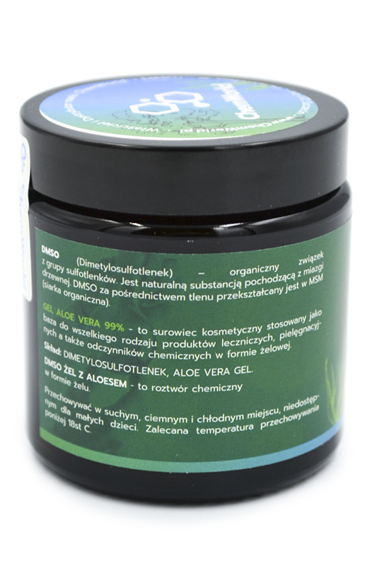 Żel DMSO o mocy 50% to połączenie najczystszego DMSO CZDA 99,96% z najczystszym Aloesem meksykańskim 99%, połączenie to tworzy krystaliczną formę żelu aby można było z niego wygodniej korzystać. Jest to produkt naturalny, jest bardzo dobrze wchłanialny dodatkowo wspomagany Aloesem.