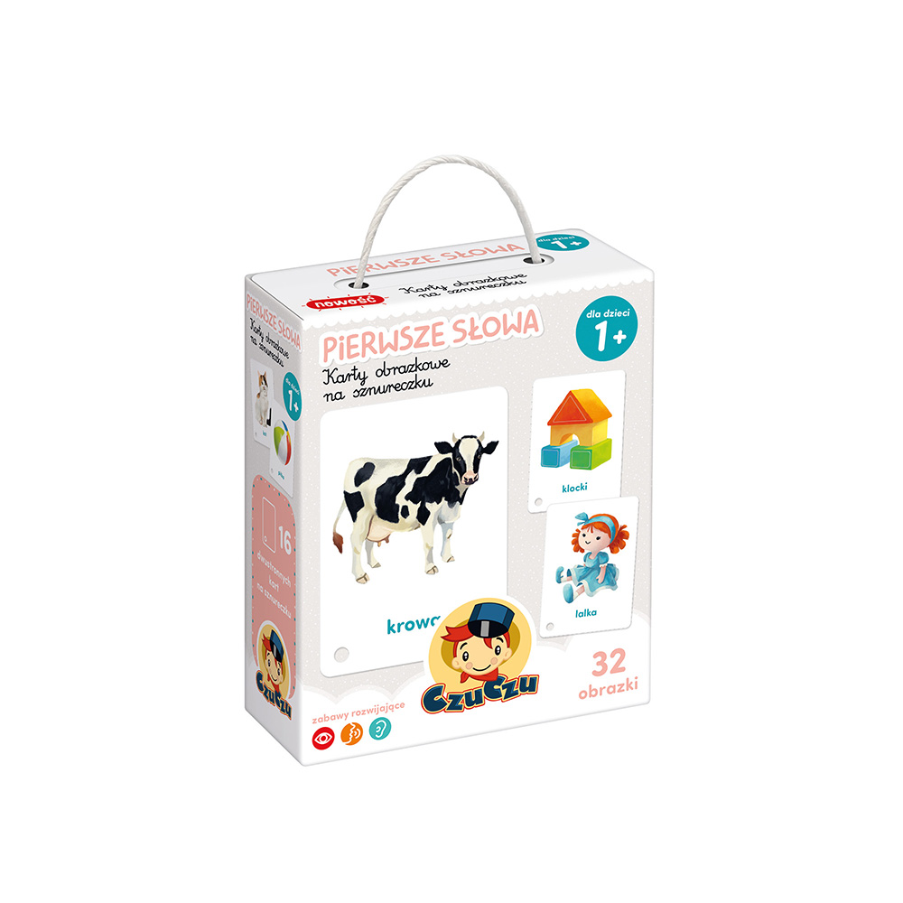 Bawcie się razem i poznawajcie nowe słowa z edukacyjną książeczką. Edukacyjne karty na sznureczku pozwalają odkrywać razem świat! Książeczka zawiera 32 piękne ilustracje, które przedstawiają to, co maluchy znają lub co mogą znaleźć w najbliższym otoczeniu. Poręczny format i oryginalne łączenie sprawiają, że kartami można bawić się na mnóstwo kreatywnych sposobów, które znakomicie wspierają rozwój poznawczy. Do zestawu dołączyliśmy poradnik pełen pomysłów na rozwijające aktywności. Wyjątkowa cecha: karty inspirują do różnorodnych edukacyjnych zabaw, których poziom trudności można dostosować do wieku i umiejętności dziecka. Bawcie się i doskonalcie różne umiejętności. Każde pudełko CzuCzu kryje milion pomysłów na zabawę! Jak się bawić z Kartami obrazkowymi na sznureczku Pierwsze słowa? Możecie na przykład: