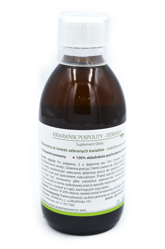 Krwawnik Pospolity 250ml. Wykonany ze świeżo zebranych kwiatów, niepasteryzowany. Stabilizowany alkoholem. Zawiera 19-20% etanol, świeże kwiaty krwawnika (Achillea millefolium L., flos)