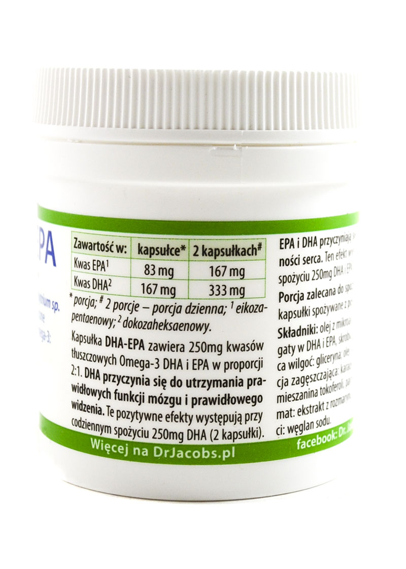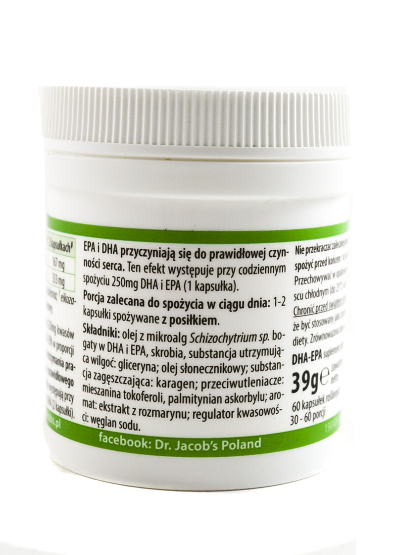 Kwasy DHA i EPA zalecane są:Nienasycone kwasy tłuszczowe DHA (kwas dokozaheksaenowy) i EPA (kwas eikozapentaenowy) to jedne z niezbędnych składników budulcowych są niezastąpionymelementem konstrukcyjnym wszystkich komórek organizmu. Należy je dostarczać z pożywieniem, ponieważ organizm nie ma zdolności wytwarzania w odpowiedniej ilości tych kwasów. Suplementacja DHA jest szczególnie ważna przy spożywaniu niewielkiej ilości ryb (główne źródło DHA). DHA-EPA to jeden z niewielu produktów na rynku, które mogą stosować także wegetarianie i weganie. Algi są zdrową, roślinną alternatywą jako źródło ważnych dla zdrowia kwasów tłuszczowych Omega-3. Olej w DHA-EPA uzyskany jest z mikroalg Schizochytrium. Tylko jedna kapsułka DHA-EPA zawiera aż 250mg kwasów DHA i EPA w proporcji 2:1 (ok. 166,6 mg DHA, ok. 83,3 mg EPA). Sposób użycia i przechowywanie:1 - 2 kapsułki wraz z posiłkiem.Nie przekraczać zalecanej porcji do spożycia w ciągu dnia! Przechowywać w szczelnie zamkniętym opakowaniu w miejscu chłodnym (15-25°C), suchym i niedostępnym dla małych dzieci. Chronić przed światłem słonecznym. Suplement diety nie może być stosowany jako zamiennik (substytut) zrównoważonej diety. Zrównoważona dieta oraz zdrowy tryb życia są ważne. Składniki:Olej z mikroalg bogaty w DHA i EPA (58% Schizochytrium), skrobia modyfikowana, substancja utrzymująca wilgotność: glicerol; olej słonecznikowy, zagęstnik: karagen; przeciwutleniacz: ekstrakt bogaty w tokoferol, palmitynian askorbylu; naturalny aromat: ekstrakt z rozmarynu; regulator kwasowości: węglan sodu. Wartości odżywcze Dr. Jacob's DHA i EPA 60kapsSuplement diety