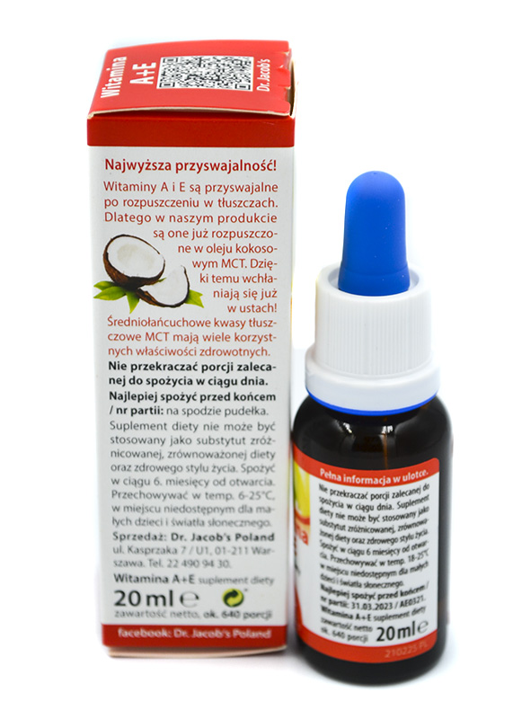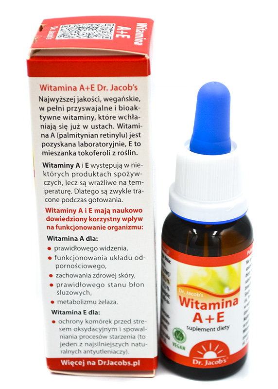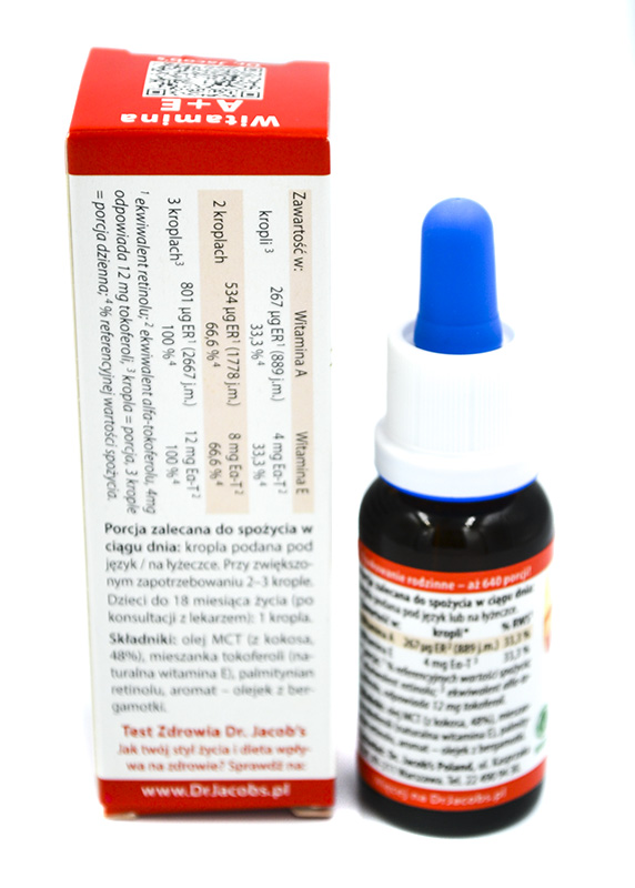 - Kompleks dwóch witamin rozpuszczalnych w tłuszczach kropla pod język lub podana na łyżeczce. Przy zwiększonym zapotrzebowaniu 2-3 krople. Zakroplić do jamy ustnej i rozprowadzić po niej językiem. Dzieci do 18 miesiąca życia (po konsultacji z lekarzem): 1 kropla. Nie należy przekraczać zalecanej dziennej porcji do spożycia. Przechowywać w sposób niedostępny dla małych dzieci. Suplement diety nie może być stosowany jako substytut (zamiennik) zrównoważonej diety. Produkt może zawierać śladowe ilości orzechów. Dr. Jacob's Witamina A+E 20mlSuplement diety
