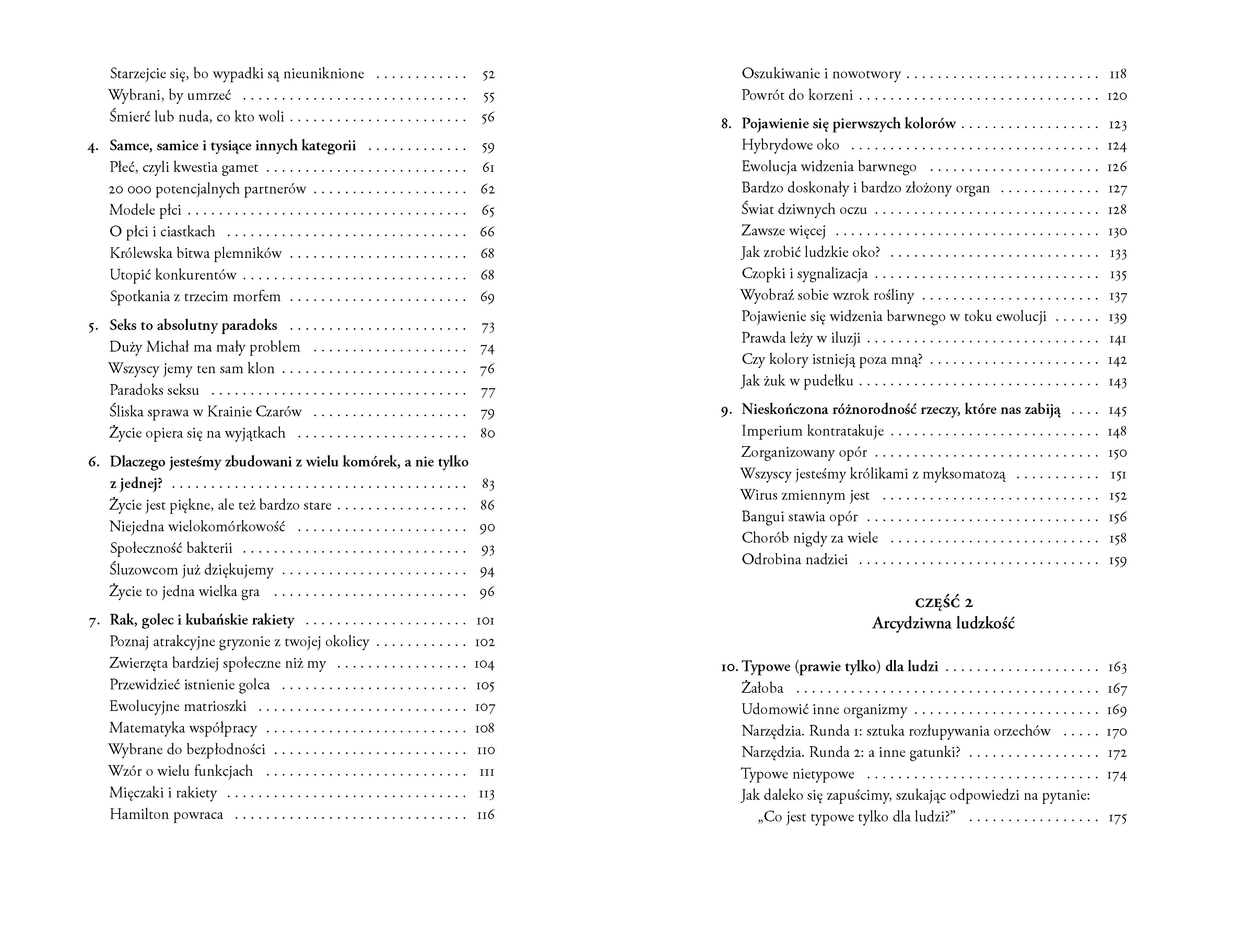 Ludzie nie lubią umierać.. A ewolucja, o dziwo, nie zrobiła nic, żeby temu zapobiec... i okazuje się, że miała do tego bardzo dobry powód. BIOLOGIA EWOLUCYJNA jest pełna prawdziwych olśnień. Pozwala zrozumieć nasze miejsce we wszechświecie. Potrafi też podważyć nasz stosunek do własnej tożsamości - do życia, śmierci, seksu, starości, do świadomości i do orgazmów. To najnowsze, ekscytujące odkrycia naukowe. Biologia ewolucyjna odpowiada na pytania, które dręczą i potrafią rozpalić wyobraźnię: Dlaczego niedźwiedzie polarne są białe, a ich kuzyni grizzly już nie? Czy istnieją powody, dla których do spłodzenia dziecka potrzebne są dwie osoby? Dlaczego nie wystarczy jedna? Albo dlaczego nie potrzeba ich siedemnastu? Po co komu starość? Dlaczego jądra goryla są małe, a szympansa duże? Dlaczego samiec błazenka (Amphiprioninae) po śmierci samicy zmienia płeć i zajmuje jej miejsce? Czy istnieją gatunki, które znalazły receptę na długowieczność? Czy kałamarnice olbrzymie (Architeuthis dux), których oczy osiągają średnicę 25 cm, czyli większą niż ludzka głowa, widzą dzięki temu lepiej? Czy aby na pewno jesteśmy ludźmi? Ta książka zawróci ci w głowie. Po jej lekturze spojrzysz na siebie zupełnie inaczej. Idealne połączenie zadziornego humoru, bezpretensjonalności i solidnej wiedzy. BIOLOGIA BEZ CENZURY! Brak recenzjix