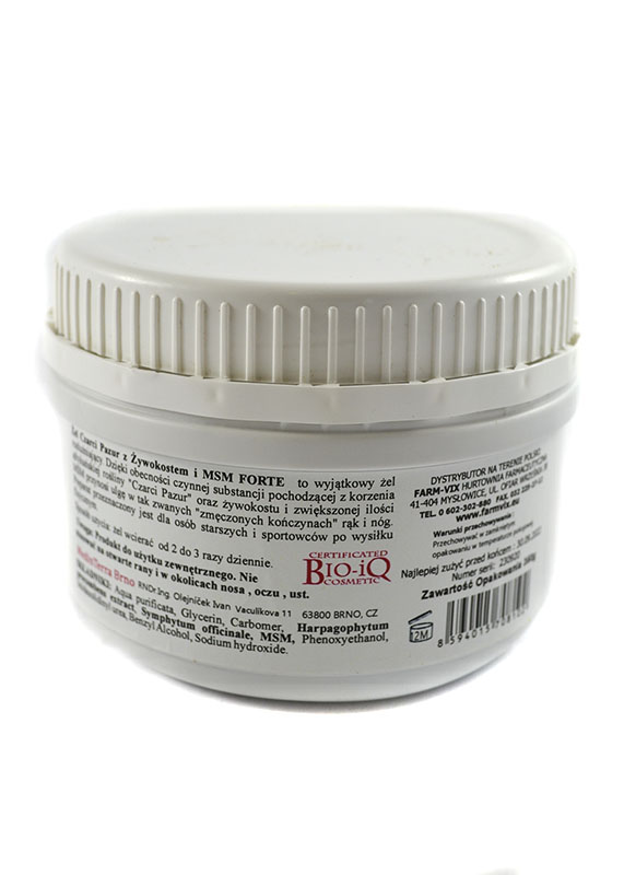 Składniki:Aqua purificata, Glycerin, Carbomer, Harpagophytum procumbens extract, Symphytum officinale, MSM, Phenoxyethanol, Imidazolidinyl urea, BenzylAlcohol, Sodium hydroxide. Sposób użycia: