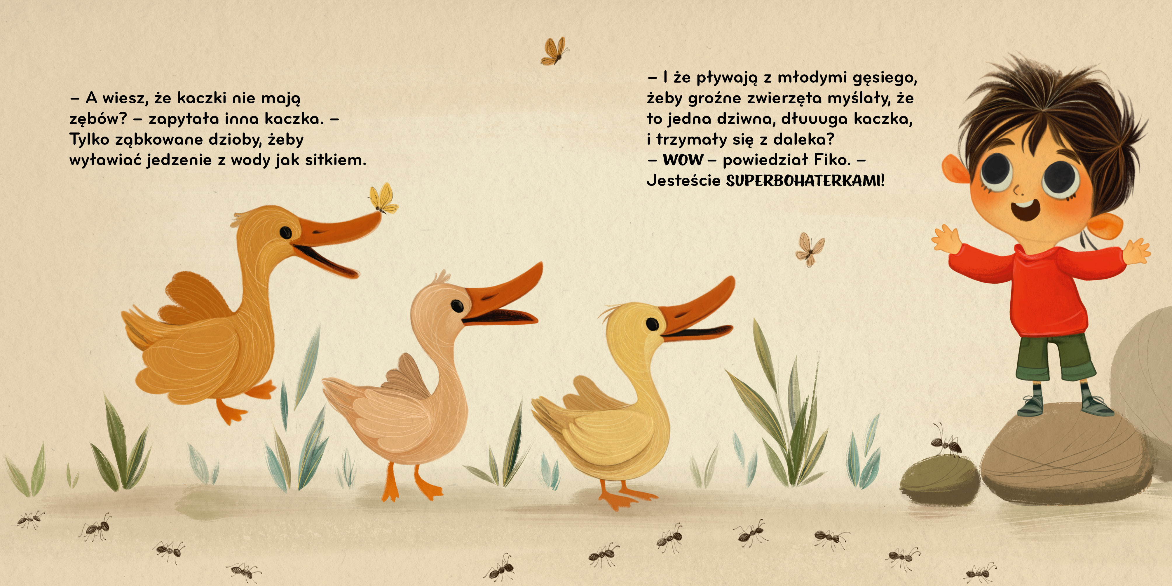 Fiko i dziadek idą nad staw, żeby nakarmić kaczki. Fiko rzuca do wody pysznego rogala, ale ptaki kręcą dziobami – bułki to dla nich same kłopoty! Brak recenzjix