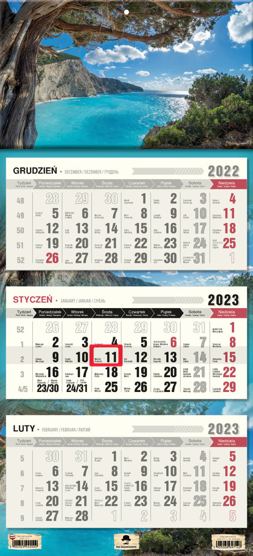 Kalendarz trójdzielny z płaską główką, format 315/680mm, główka z otworem wierconym, klasyczny układ trzech kalendariów z przesuwanym okienkiem, kalendarium wyraźne i czytelne z dużymi cyframi, posiada miejsce do notowania, dodatkowo nazwy miesięcy i dni tygodnia w języku EN, DE, UA. pełny opis produktu: Kalendarz trójdzielny z płaską główką, format 315/680mm, główka z otworem wierconym, klasyczny układ trzech kalendariów z przesuwanym okienkiem, kalendarium wyraźne i czytelne z dużymi cyframi, posiada miejsce do notowania, dodatkowo nazwy miesięcy i dni tygodnia w języku Angielskim, Niemieckim i Ukraińskim. Brak recenzjix