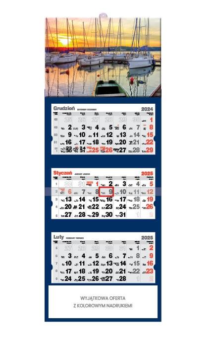 KALENDARZ TRÓJDZIELNY NA 2025 ROK WYMIAR CAŁKOWITY KALENDARZA: 32 x 85,5cm GŁÓWKA KALENDARZA: Zdjęcie uszlachetniane folią błysk, z efektem wypukłości. KALENDARIUM: wym. 28,5 x 14 cm, trójjęzyczne (PL, GB, D), z numeracją tygodni i imieninami jest przytrzymywane przez kartonowe wypustki, które zapobiegają jego odstawaniu od plecków kalendarza. WYKOŃCZENIE: kartonowa zawieszka, pasek z czerwonym przesuwanym okienkiem, miejsce na notatki. Brak recenzjix