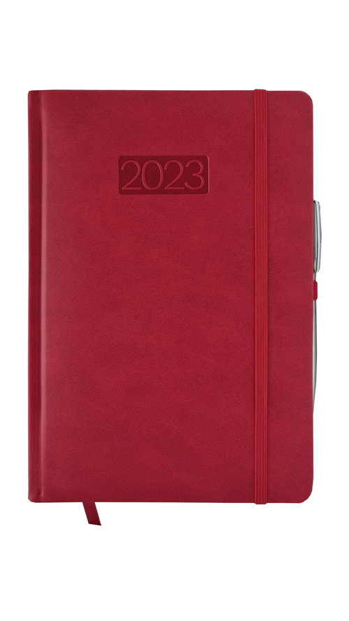 KK-A5D L – Kalendarz Książkowy A5 Dzienny LUX, soboty i niedziele na oddzielnych stronach. Zawiera 416 stron, papier chamois (kremowy), kalendaria w trzech językach (PL EN DE), oprawa twarda, szyta, na gąbce (idealna do tłoczenia), zaokrąglone rogi, dodatkowo zakładka, uchwyt na długopis i elastyczne zapięcie (gumka) w kolorze oprawy.