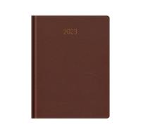Kalendarz 2023 książkowy B5 Edica z tasiemką oraz kopertą na drobiazgi. Tydzień na dwóch stronach. Oprawa twarda, piankowana z brązową okładką oraz kontrastowym obszyciem ecru. Tłoczony miedziany datownik. Papier biały FSC o gramaturze 80g/m2.