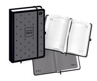 Matowa okładka z efektownym nadrukiem UV. W środku kolorowa wyklejka. Twarda oprawa skutecznie chroni zawartość przed zniszczeniem. Elastyczna gumka chroni luźne notatki przed wypadnięciem. Kalendarz w układzie 1 dzień na stronie z podziałem na godziny pozwala na szczegółowe zaplanowanie każdego dnia. Wyposażony w praktyczne dodatki: tasiemkę do zaznaczania strony i pętelkę na długopis. W środku także: adresówka, praktyczne kalendarium oraz miejsce na dodatkowe notatki. Specyfikacja: