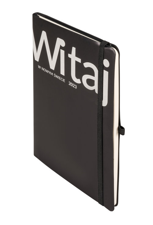 format: A5, wymiary okładki: 210x145 mm, układ: tydzień do wglądu, ilość stron: 144, oprawa: miękka, materiał: skóra ekologiczna z nadrukiem, gramatura papieru: 80g, kolor papieru: off white, dodatki: plan roku 2023, ważne wydarzenia, skorowidz adresowy, notatki, pionowa gumka zamykająca: czarna, wstążka: czarna, gumka na długopis: czarna, zaokrąglone rogi: tak, wyklejka: czarna, koperta: tak, dostępne kolory: czarno-biały, czarny