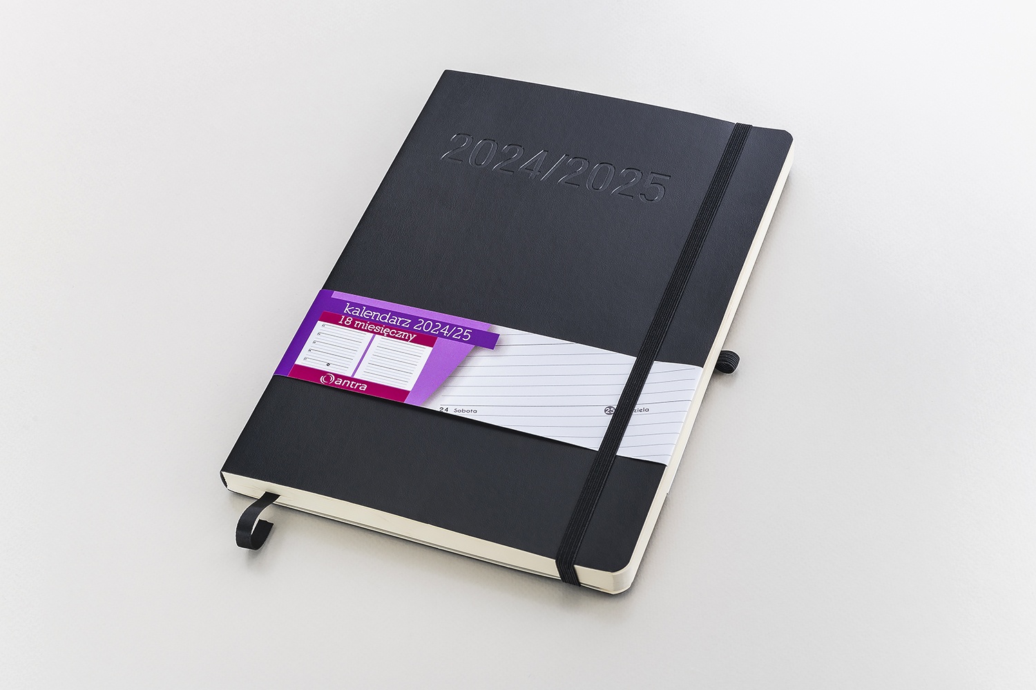 • Wnętrze kalendarza: skrócony kalendarz 2024-2026, notatnik - 1 strona, kalendarz 2024-2025 z miesiącami, ważne wydarzenia - 3 strony, plan roku 2024-2025, adresy od A do Z (po 2 litery na stronie), notatnik – 12 stron