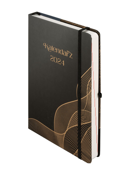 Kolekcja: Glamur Format: A5 Wymiary okładki: 144x210 mm Układ: dzień na stronie Ilość stron: 352 Oprawa: twarda Materiał: papier Gramatura papieru: 80g Kolor papieru: chamoise Dodatki: plan roku 2024, ważne wydarzenia, skorowidz adresowy, notatki Pionowa gumka zamykająca: tak Wstążka: czarna Gumka na długopis: tak, czarna Zaokrąglone rogi: tak Wyklejka: czarna Koperta: tak Brak recenzjix