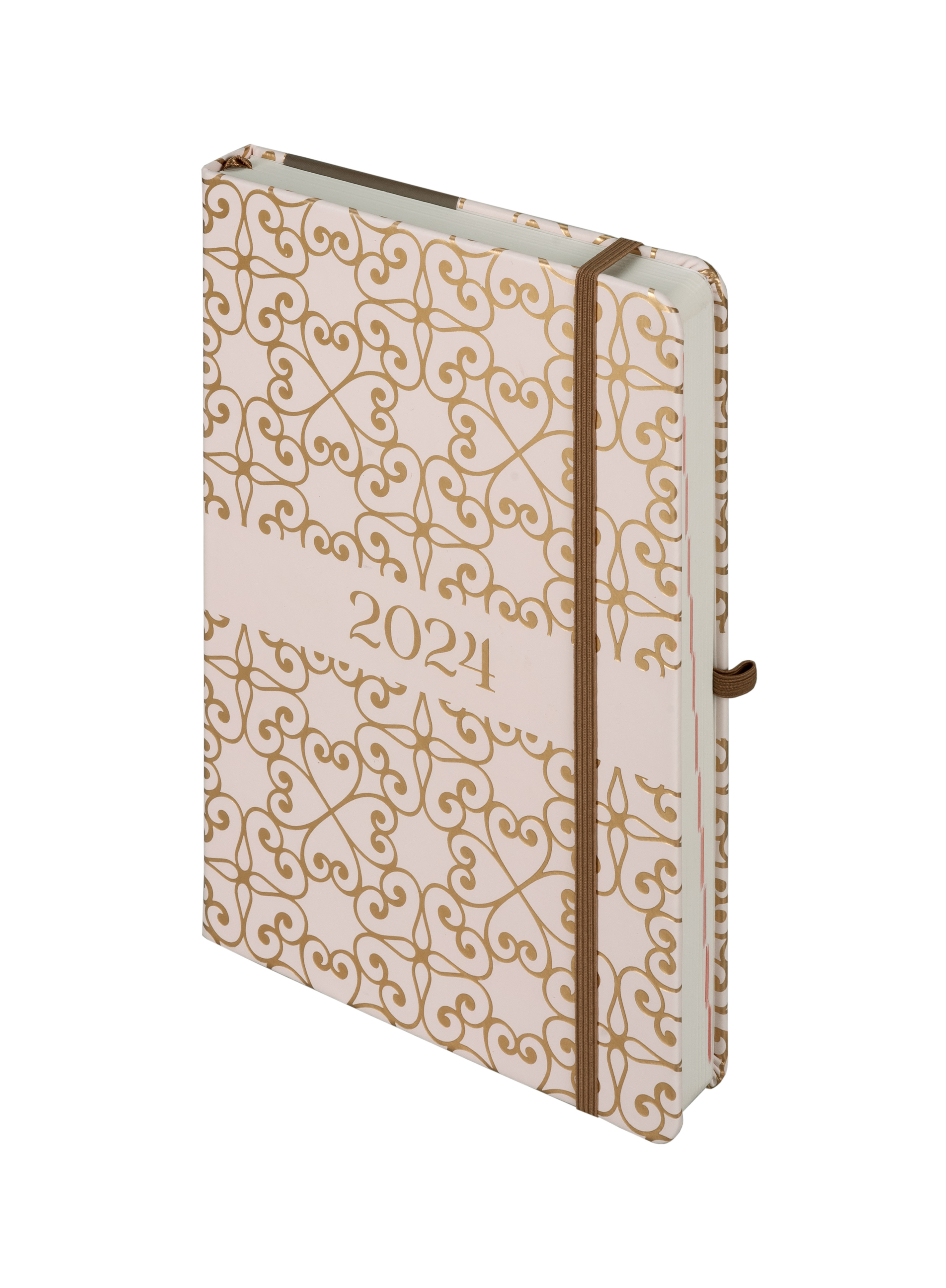 Kolekcja: Glamur Format: A5 Wymiary okładki: 144x210 mm Układ: dzień na stronie Ilość stron: 352 Oprawa: twarda Materiał: papier Gramatura papieru: 80g Kolor papieru: chamoise Dodatki: plan roku 2024, ważne wydarzenia, skorowidz adresowy, notatki Pionowa gumka zamykająca: tak Wstążka: czarna Gumka na długopis: tak, czarna Zaokrąglone rogi: tak Wyklejka: czarna Koperta: tak