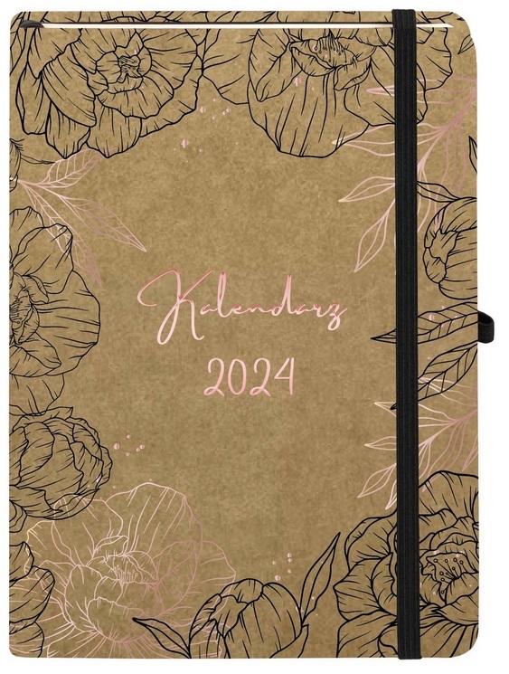 Kolekcja: Kraft Format: A5 Wymiary okładki: 144x211 mm Układ: tydzień na stronie Ilość stron: 144 Oprawa: twarda Materiał: papier Gramatura papieru: 80g Kolor papieru: chamoise Dodatki: plan roku 2024, ważne wydarzenia, skorowidz adresowy, notatki Pionowa gumka zamykająca: ciemno-różowa Wstążka: ciemno-różowa Gumka na długopis: tak, Zaokrąglone rogi: nie Wyklejka: chamoise Koperta: tak