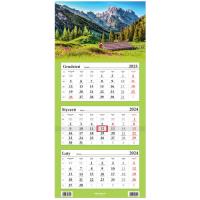 Klasyczny kalendarz trójdzielny na 2024 rok, podłużny, z opaską z przesuwnym okienkiem do zaznaczenia obecnego dnia. Kalendarz można złożyć w 3 miejscach. Zawiera 3 odrębne, zrywane kalendaria po 12 kartek. Kalendarz jest zapakowany w folię ochronną. Sposób zawieszania - otwór w górnej części. Wymiar złożonego kalendarza to 32 x 19 cm, a rozłożonego kalendarza to 32 x 67 cm. Wyprodukowano w Polsce.