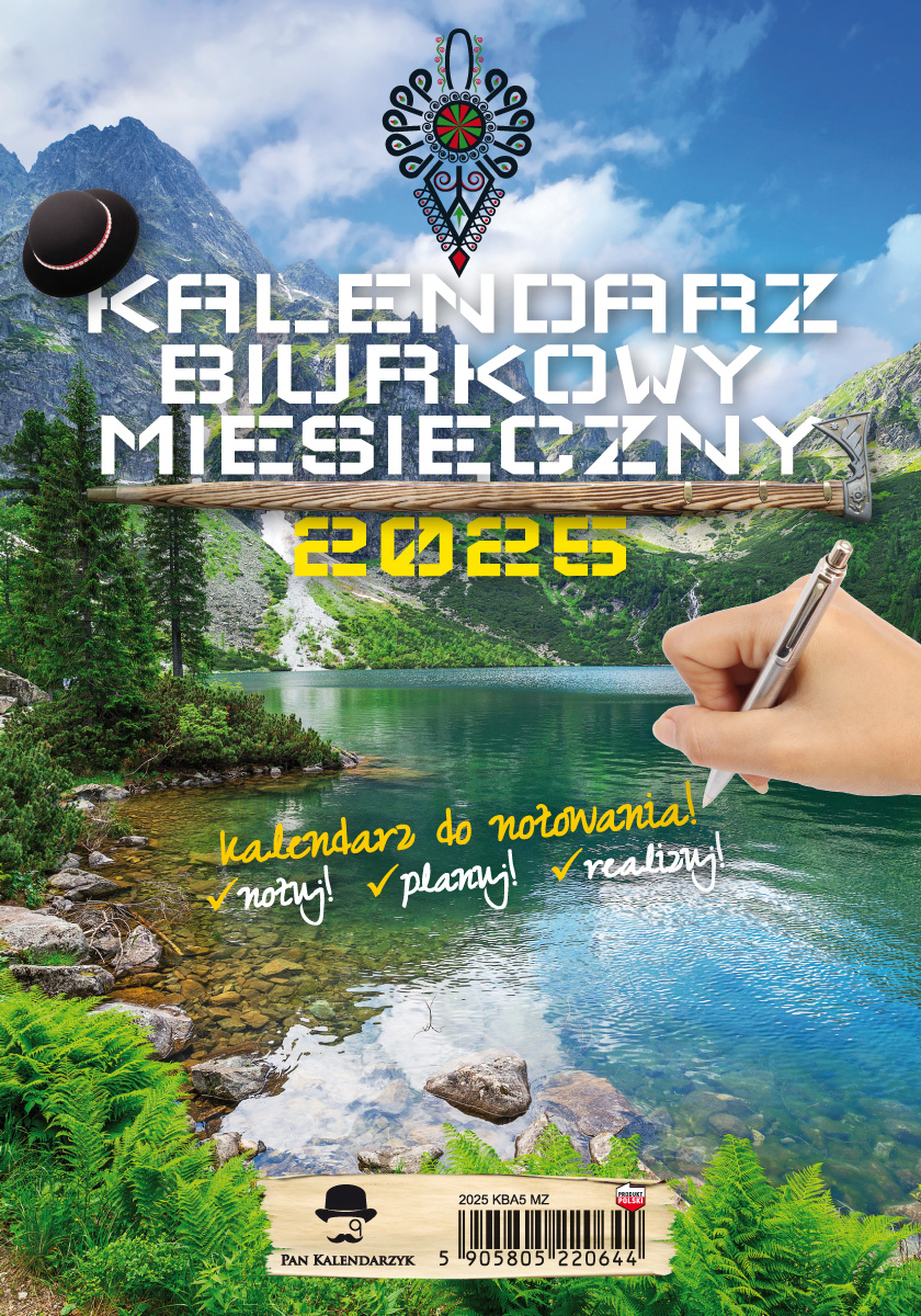 Kalendarz Biurkowy A5 MIESIĘCZNY PIONOWY. Oprawa spirala na grubej podstawie kartonowej. Format 145/210mm. Papier kredowy. 12 strony (układ miesięczny ) + okładka. Czytelne kalendarium z miejscem na notatki, znaki zodiaku, podpisane zdjęcia i górskie sentencje na każdy miesiąc.