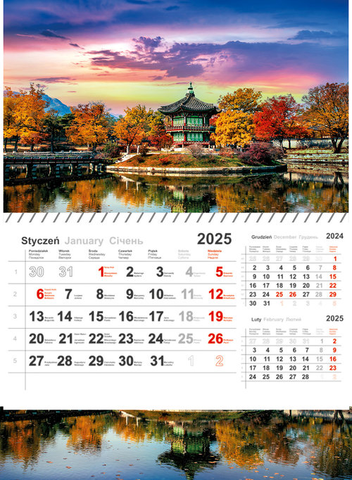 Kalendarium: język polski, angielski, ukraiński, numeracja tygodni; polskie imieniny, kalendarium dwunastokartkowe na spirali, trzy miesiące na jednej karcie (bieżący - dominujący, poprzedni i następny pomniejszone, jedynie jako uzupełnienie), Wykończenie: opaska z przesuwnym okienkiem; kalendarz składany