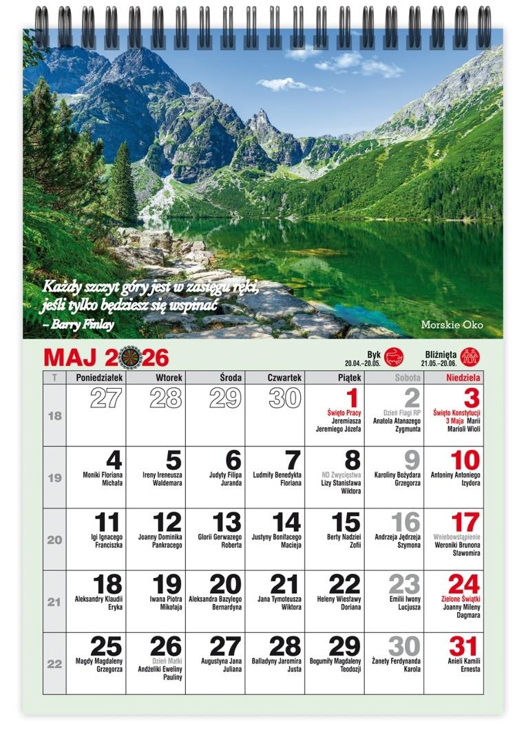 Kalendarz zawiera imieniny, nazwy świąt, numeracje tygodni, znaki zodiaku, wschody i zachody słońca. Zdjęcia pięknych widoków górskich