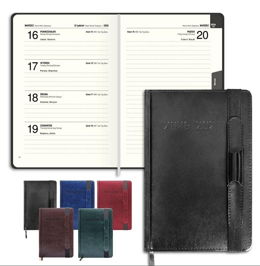 Format A5 i solidna, skóropodobna twarda okładka zapewniają wygodę i trwałość, a gumka z uchwytem na długopis pozwala mieć wszystko, czego potrzebujesz, zawsze pod ręką. Dzięki temu kalendarz staje się nie tylko narzędziem do planowania, ale też nieodzownym elementem codziennej pracy.