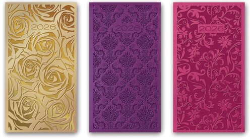 Kalendarz w układzie tygodniowym (tydzień na rozkładówce). Format kieszonkowy A6 (blok: 8,5 x 15,3 cm), papier kremowy, druk szaro-bordowy, registry drukowane. Wstążka-zakładka; 128 stron; notes teleadresowy. Dwa rodzaje okleiny skóropodobnej: gładka lub z tłoczonymi reliefowymi deseniami oraz okleina graficzna (drukowana). Typ okładki: standard bez gąbki.