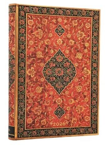 Kalendarz ekskluzywnej marki Paperblanks, Okładka stanowi replikę oryginalnej XVIII-wiecznej oprawy poematu "Khamsa (Pięć Skarbów)" autorstwa perskiego poety Nizami'ego, Każdy dzień jest na osobnej stronie, soboty i niedziele są razem, Oprawa twarda, Kalendarium w języku angielskim, W środku miejsce na notatki, roczny planer, oznaczone wybrane święta międzynarodowe, mini kalendarium, międzynarodowe numery telefonów, strefy czasowe, Kalendarz posiada 2 satynowe wstążki jako zakładki, Na końcu po wewnętrznej stronie okładki jest koperta na drobne notatki, wizytówki czy paragony oraz oraz mini skorowidz na adresy i telefony, Papier ekologiczny, bezkwasowy, gramatura 80, Zamknięcie na gumkę, Wymiary 13 x 18 cm, 416 stron Brak recenzjix