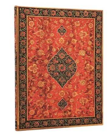 Kalendarz ekskluzywnej marki Paperblanks, Okładka stanowi replikę oryginalnej XVIII-wiecznej oprawy poematu "Khamsa (Pięć Skarbów)" autorstwa perskiego poety Nizami'ego Format Ultra typu Vertical - cały tydzień rozplanowany jest na 2 stronach z podziałką godzinową, Oprawa twarda, Kalendarium w języku angielskim, W środku miejsce na notatki, roczny planer, oznaczone wybrane święta międzynarodowe, mini kalendarium, międzynarodowe numery telefonów, strefy czasowe, Kalendarz posiada 2 satynowe wstążki jako zakładki, Na końcu po wewnętrznej stronie okładki jest koperta na drobne notatki, wizytówki czy paragony oraz oraz mini skorowidz na adresy i telefony, Papier ekologiczny, bezkwasowy, gramatura 100, Zamknięcie na gumkę, Wymiary 23 x 18 cm, 160 stron Brak recenzjix