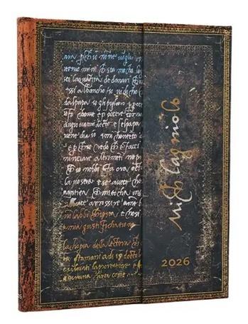 Kalendarz ekskluzywnej marki Paperblanks, Okładka z fragmentem listu napisanego przez Michała Anioła, jednego z najważniejszych twórców włoskiego renesansu, Format Ultra typu Horizontal - cały tydzień rozplanowany na 2 stronach, Oprawa twarda, Kalendarium w języku angielskim, W środku miejsce na notatki, roczny planer, oznaczone wybrane święta międzynarodowe, mini kalendarium, międzynarodowe numery telefonów, strefy czasowe, Kalendarz posiada 2 satynowe wstążki jako zakładki, Na końcu po wewnętrznej stronie okładki jest koperta na drobne notatki, wizytówki czy paragony oraz oraz mini skorowidz na adresy i telefony, Papier ekologiczny, bezkwasowy, gramatura 100, Zamknięcie na magnes, Wymiary 23 x 18 cm, 160 stron Brak recenzjix