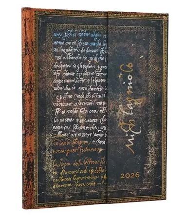 Kalendarz ekskluzywnej marki Paperblanks, Okładka z fragmentem listu napisanego przez Michała Anioła, jednego z najważniejszych twórców włoskiego renesansu, Format Ultra typu Vertical - cały tydzień rozplanowany jest na 2 stronach z podziałką godzinową, Oprawa twarda, Kalendarium w języku angielskim, W środku miejsce na notatki, roczny planer, oznaczone wybrane święta międzynarodowe, mini kalendarium, międzynarodowe numery telefonów, strefy czasowe, Kalendarz posiada 2 satynowe wstążki jako zakładki, Na końcu po wewnętrznej stronie okładki jest koperta na drobne notatki, wizytówki czy paragony oraz oraz mini skorowidz na adresy i telefony, Papier ekologiczny, bezkwasowy, gramatura 100, Zamknięcie na magnes, Wymiary 23 x 18 cm, 160 stron Brak recenzjix