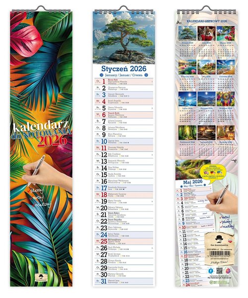 Kalendarz 2026 ŚCIENNY PASKOWY WĄSKI drukowany jednostronnie.