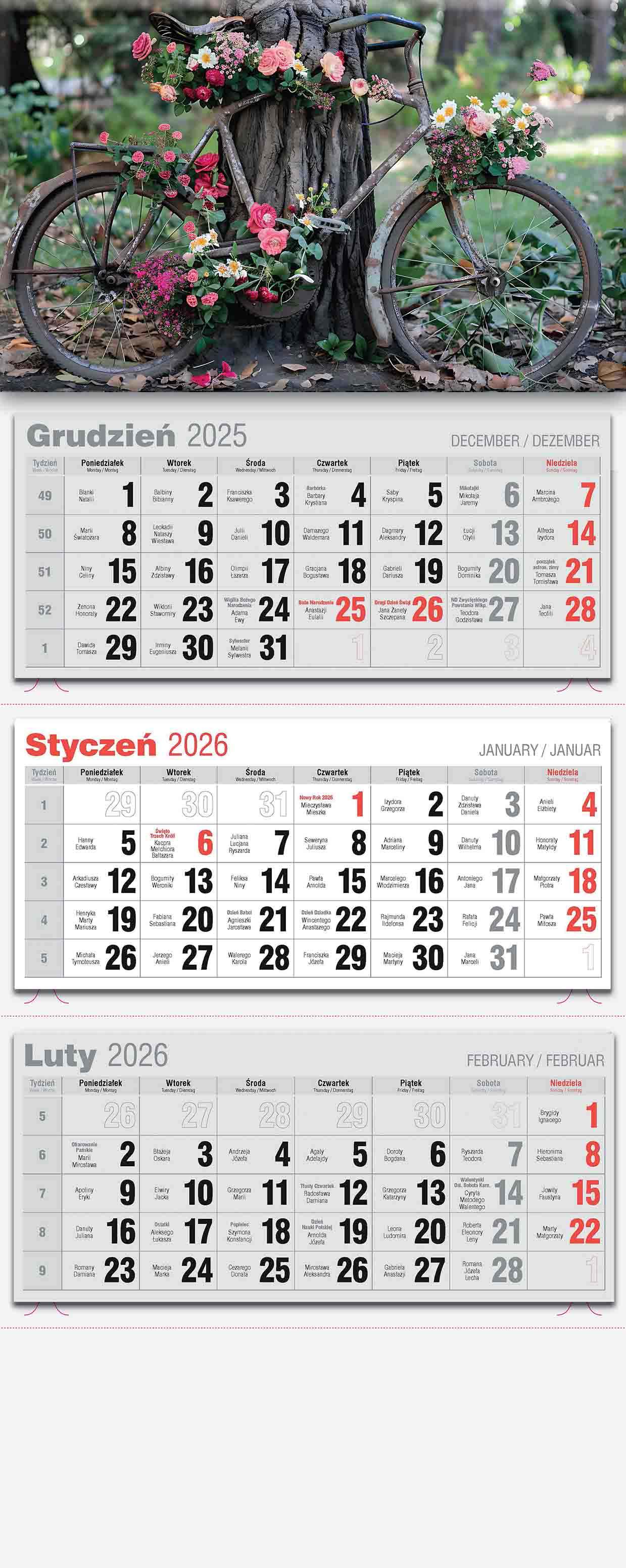 Kalendarz Trójdzielny Lux jest produktem dedykowanym niewielkim firmom – pod kalendariami oferuje przestrzeń na personalizowany przekaz reklamowy wielkości 310x75 mm. Kalendaria zawierają oznaczenia miesięcy i dni tygodnia w trzech językach (PL, EN, DE) oraz imieniny i typowe święta.