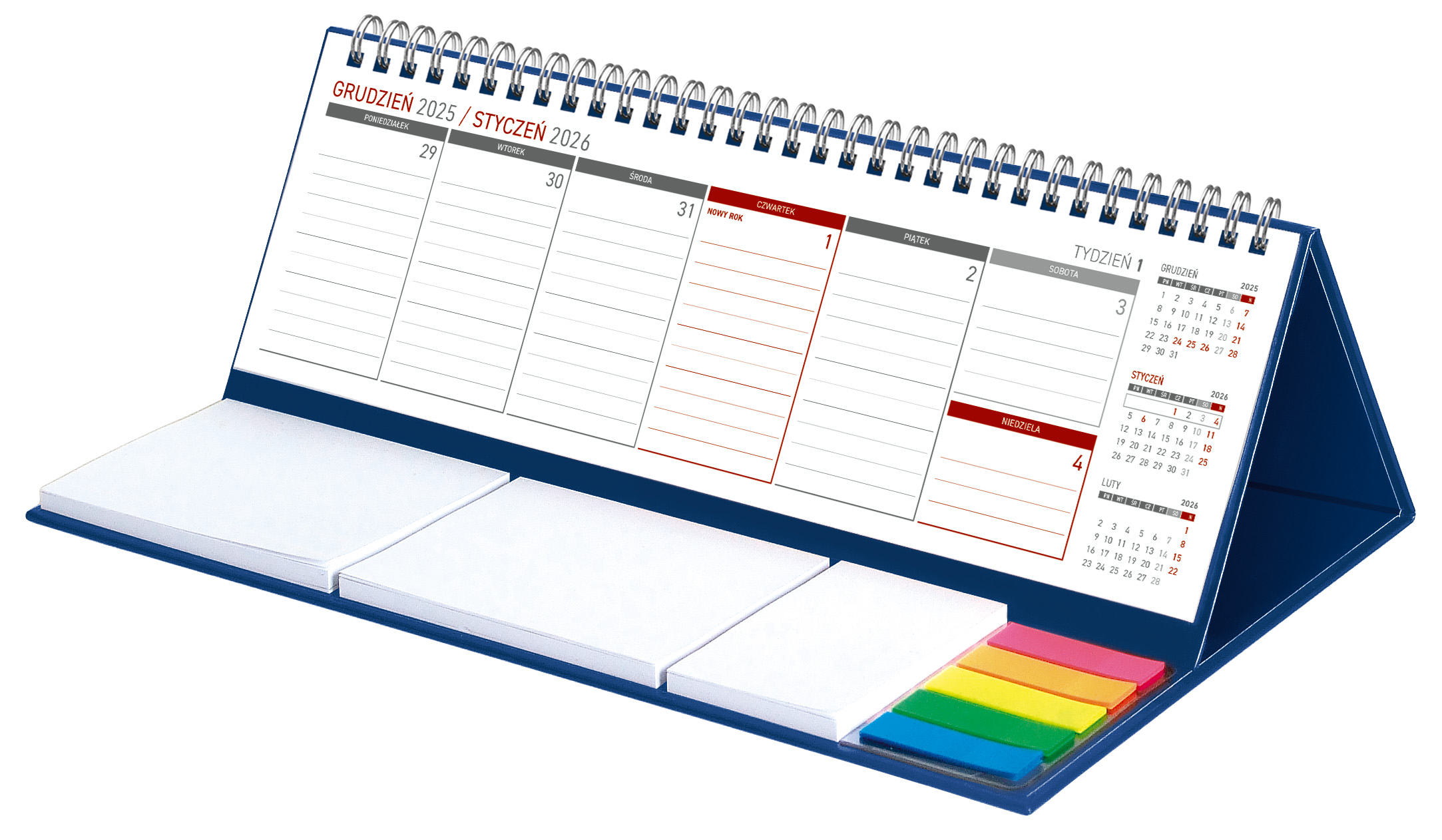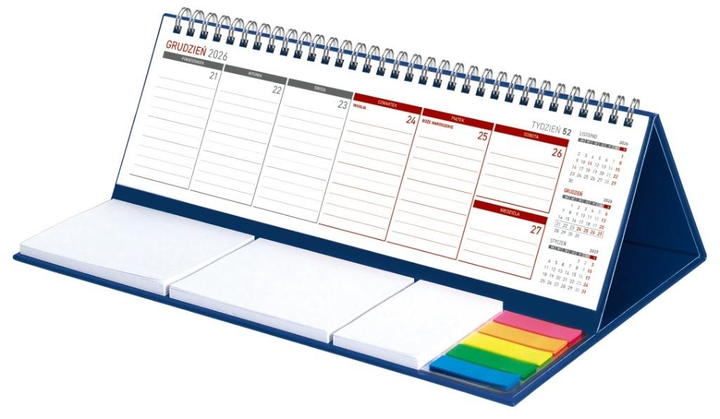 Wygodny kalendarz stojący na biurko z przejrzystym kalendarium w układzie tygodniowym z miejscem do notowania. Poręczne samoprzylepne karteczki. Kalendarium na spirali. W kalendarzu zaznaczone święta. Na tylnej części podstawki kalendarza istnieje możliwość naniesienia reklamy na obszarze o wymiarach 305 x 100 mm w formie nadruku lub naklejki. Od 100 szt. istnieje możliwość wykonania indywidualnej podstawki oraz kalendarium full kolor.