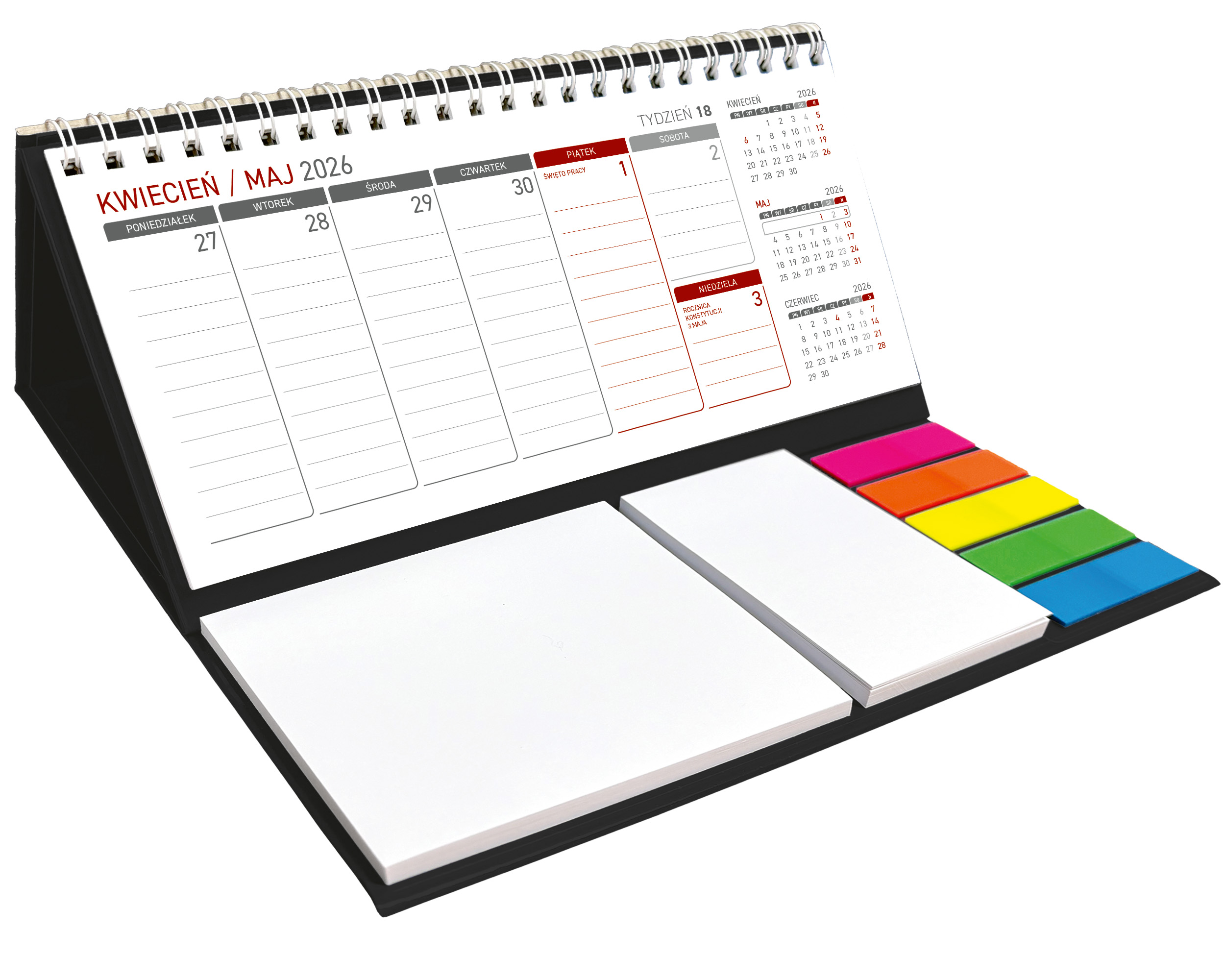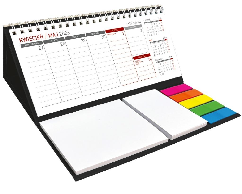 Praktyczny kalendarz stojący na biurko z przejrzystym kalendarium w układzie tygodniowym z miejscem do notowania. Poręczne samoprzylepne karteczki. W kalendarzu zaznaczone święta. Na tylnej części podstawki kalendarza istnieje możliwość naniesienia reklamy na obszarze o wymiarach 210 x 110 mm w formie nadruku lub naklejki. Od 100 szt. istnieje możliwość wykonania indywidualnej podstawki oraz kalendarium full kolor.