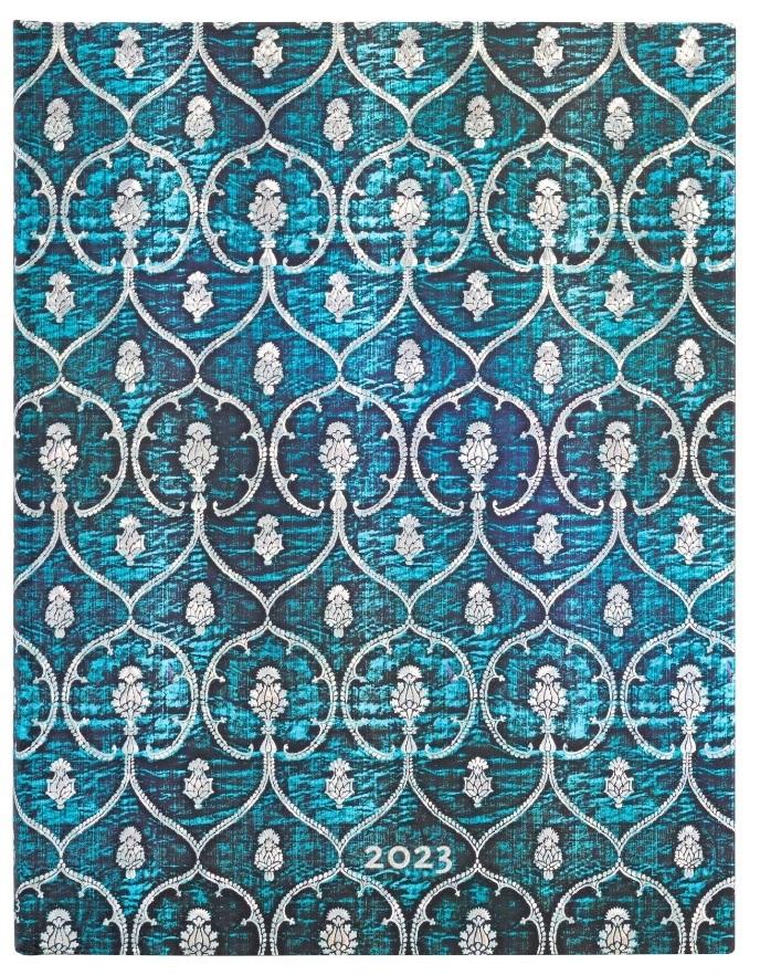 Kalendarz 2023 ekskluzywnej marki Paperblanks. Format ultra typu vertical - cały tydzień rozplanowany jest na 2 stronach z podziałką godzinową. Kalendarium w języku angielskim. W środku miejsce na notatki, roczny planer, oznaczone wybrane święta międzynarodowe, mini kalendarium, międzynarodowe numery telefonów, strefy czasowe, dodatkowe informacje, mini skorowidz na adresy i telefony. Oprawa twarda. Zamkniecie na gumkę. Wymiary 180x230 mm (format ultra), 160 stron. Kalendarz posiada 2 satynowe wstążki jako zakładki. Na końcu na wewnętrznej stronie okładki jest koperta na drobne notatki czy paragony. Papier ekologiczny, bezkwasowy, gramatura 100. Całość zdobi piękna okładka inspirowana wzornictwem z XV wieku.