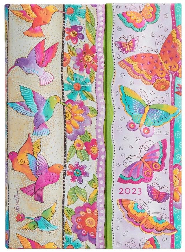 Kalendarz 2023 ekskluzywnej marki Paperblanks. Każdy dzień rozplanowany jest na osobnej stronie (włącznie z sobota i niedzielą). Kalendarium w języku angielskim. W środku miejsce na notatki, roczny planer, oznaczone wybrane święta międzynarodowe, mini kalendarium, międzynarodowe numery telefonów, strefy czasowe, dodatkowe informacje, mini skorowidz na adresy i telefony. Oprawa twarda. Zamkniecie na magnes. Wymiary 130x180 mm (format midi), 416 stron. Kalendarz posiada 2 satynowe wstążki jako zakładki. Na końcu na wewnętrznej stronie okładki jest koperta na drobne notatki czy paragony. Papier ekologiczny, bezkwasowy, gramatura 80. Wzór na okładce odtwarza obraz Laurel Burch, która była artystką-samoukiem i hipiską. Latające motyle i kolibry były jednym z jej ulubionych motywów.