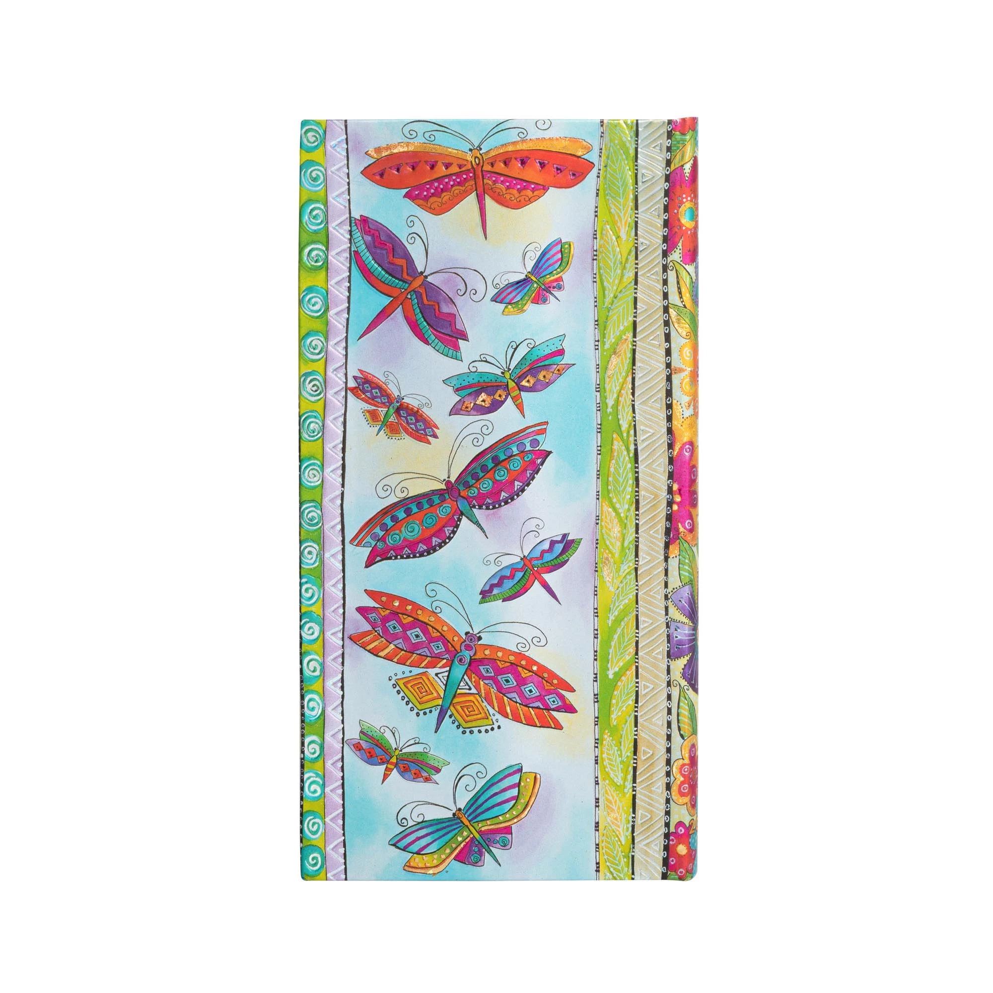Kalendarz 2023 ekskluzywnej marki Paperblanks. Format slim typu horizontal - cały tydzień rozplanowany jest na 2 stronach. Kalendarium w języku angielskim. W środku miejsce na notatki, roczny planer, oznaczone wybrane święta międzynarodowe, mini kalendarium, międzynarodowe numery telefonów, strefy czasowe, dodatkowe informacje, mini skorowidz na adresy i telefony. Oprawa twarda. Zamkniecie na gumkę. Wymiary 95x180 mm, 160 stron. Kalendarz posiada 2 satynowe wstążki jako zakładki. Na końcu na wewnętrznej stronie okładki jest koperta na drobne notatki czy paragony. Papier ekologiczny, bezkwasowy, gramatura 100. Wzór na okładce odtwarza obraz Laurel Burch, która była artystką-samoukiem i hipiską. Latające motyle i kolibry były jednym z jej ulubionych motywów.
