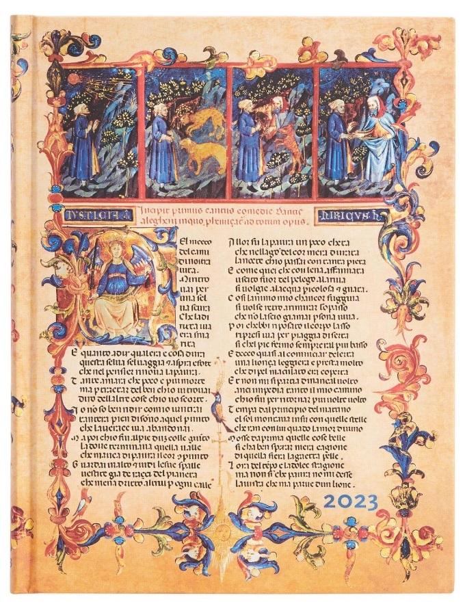 Kalendarz 2023 ekskluzywnej marki Paperblanks. Format ultra typu vertical - cały tydzień rozplanowany jest na 2 stronach z podziałką godzinową. Kalendarium w języku angielskim. W środku miejsce na notatki, roczny planer, oznaczone wybrane święta międzynarodowe, mini kalendarium, międzynarodowe numery telefonów, strefy czasowe, dodatkowe informacje, mini skorowidz na adresy i telefony. Oprawa twarda. Zamkniecie na gumkę. Wymiary 180x230 mm (format ultra), 160 stron. Kalendarz posiada 2 satynowe wstążki jako zakładki. Na końcu na wewnętrznej stronie okładki jest koperta na drobne notatki czy paragony. Papier ekologiczny, bezkwasowy, gramatura 100. Okładka odtwara pięknie iluminowańą pierwszą stronę Boskiej Komedii Dantego.