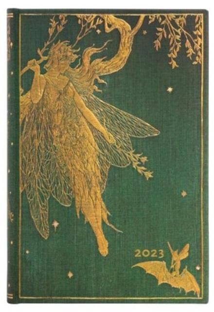 Kalendarz 2023 ekskluzywnej marki Paperblanks. Każdy dzień rozplanowany jest na osobnej stronie (włącznie z sobota i niedzielą). Kalendarium w języku angielskim. W środku miejsce na notatki, roczny planer, oznaczone wybrane święta międzynarodowe, mini kalendarium, międzynarodowe numery telefonów, strefy czasowe, dodatkowe informacje, mini skorowidz na adresy i telefony. Oprawa twarda. Zamkniecie na gumkę. Wymiary 95x140 mm (format mini), 416 stron. Kalendarz posiada 2 satynowe wstążki jako zakładki. Na końcu na wewnętrznej stronie okładki jest koperta na drobne notatki czy paragony. Papier ekologiczny, bezkwasowy, gramatura 80. Okładkę zdobi ilustracja pochodząca z pierwszego wydania The Olive Fairy Book szkockiego poety i antropologa Andrew Langa. Skompilowana w 1907 roku przez Langa i zilustrowana przez Henry'ego Justice'a Forda, książka była jedną z dwunastoczęściowej serii znanej jako Langs Fairy Books, w której każdą książkę nazwano na podstawie koloru jej wróżki.